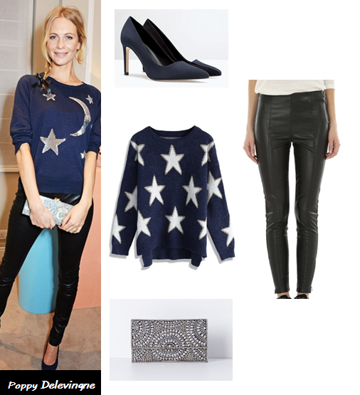 Poppy Delevingne: Combinar azul marino y negro hace tiempo que ya no es un pecado en el mundo modil, y si el negro es un tejido de cuero y añades algo de brillo plateado, el resultado es tan estupendo como este.