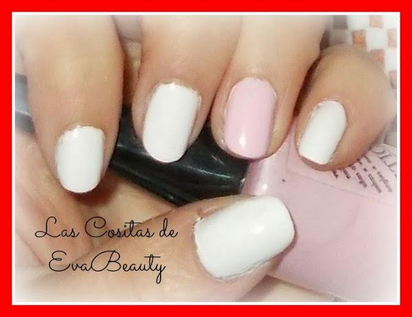 Para la base del diseño de hoy, he escogido un tono blanco y un tono rosita claro, que aplicaré en el dedo anular solamente, a modo de contraste.