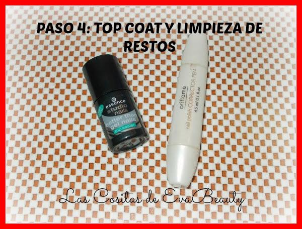 Una vez seca, aplicamos top coat, yo he utilizado éste de Essence que me encanta y va genial. Limpiamos los restos con un lápiz corrector como éste de Oriflame, o un algodón con acetona y ya tenemos nuestra manicura terminada.