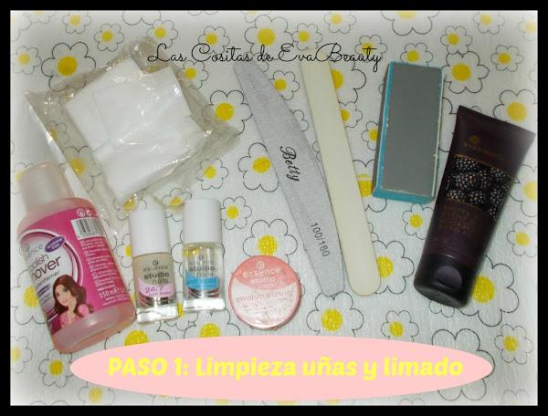 - Comenzamos nuestra manicura limpiando nuestras uñas de esmalte anterior , si lo tuvieramos, con quitaesmalte y algodón. Yo he usado el quitaesmalte de Essence de Fresa y Fruta de la Pasión.