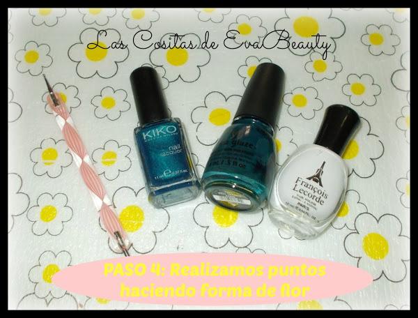 He escogido éstos tonos de esmaltes, éste azul de kiko que me fascina, ya que hace como aguas esmeraldas con la luz y és una pasada, también lo he combinado con otro azul más apagado pero que me encanta también de China Glaze y por último, usé éste blanco para el centro de la flor.