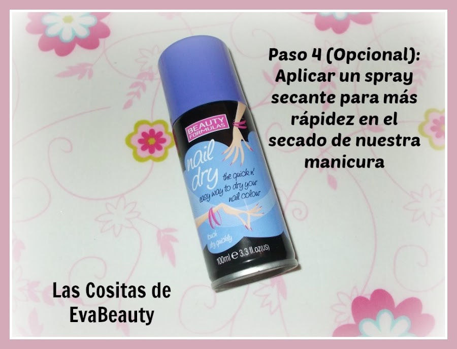 Como paso opcional, a mí me gusta utilizar un spray secante, para que la manicura se seque antes.
