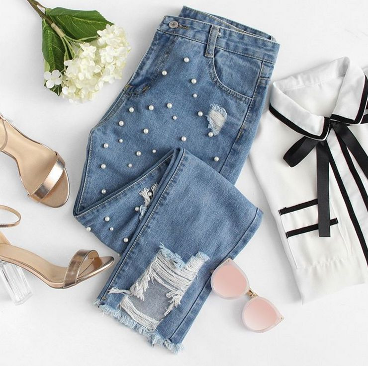 La combinacion del vaquero roto con las perlas es perfecta para dar un toque más defandado al outfit y combinado con esta blusa no puede quedar mejor.