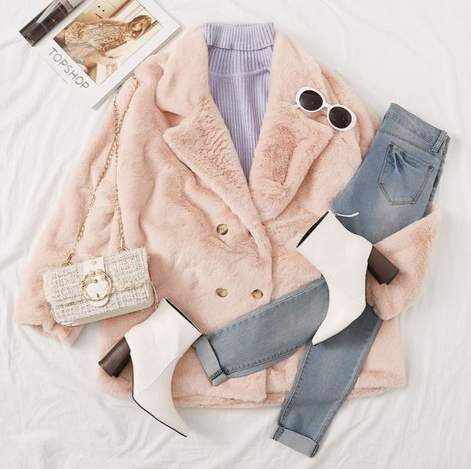 Para el Lunes he optado por un Prenda de abrigo de pelo en color rosa de lo más calentito, combinando un jersey de cuello alto en tonos morados y vaquero.