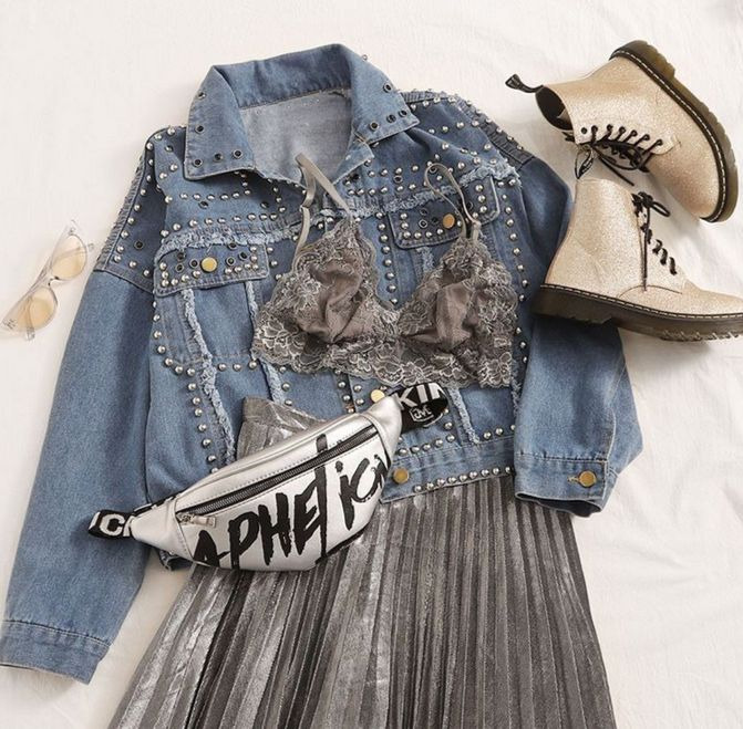 Y para el viernes salir y dar una vuelta nada como esta falda plisada plateada que tanto me gusta creo que le queda genial esta chaqueta denim de tachuelas.