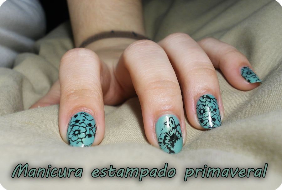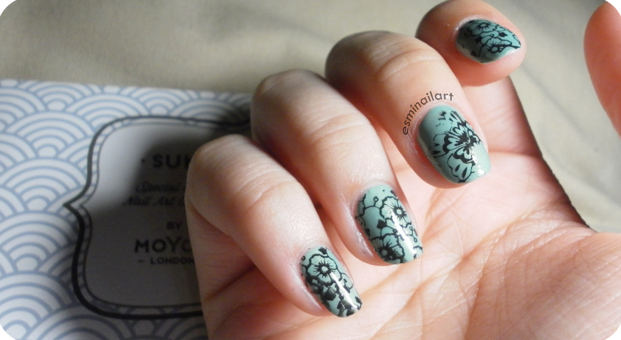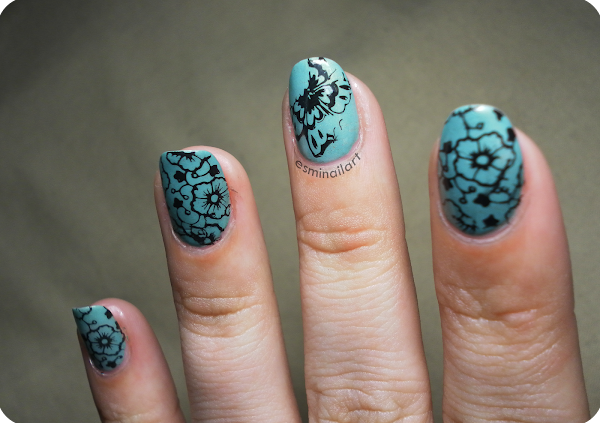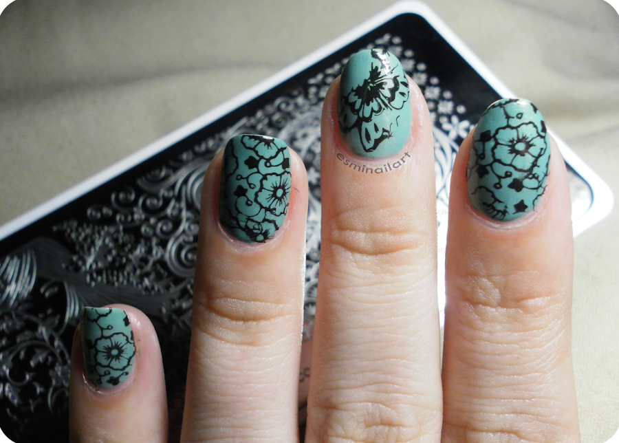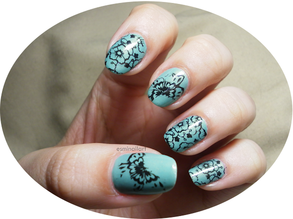 Yo para la manicura de hoy decidí usar el diseño del kimono de flores de la chica en las uñas del índice, anular y meñique, y la mariposa para el pulgar y corazón. Como base utilicé el esmalte 36 Mint me up de Catrice y para estampar el negro de Yes Love.