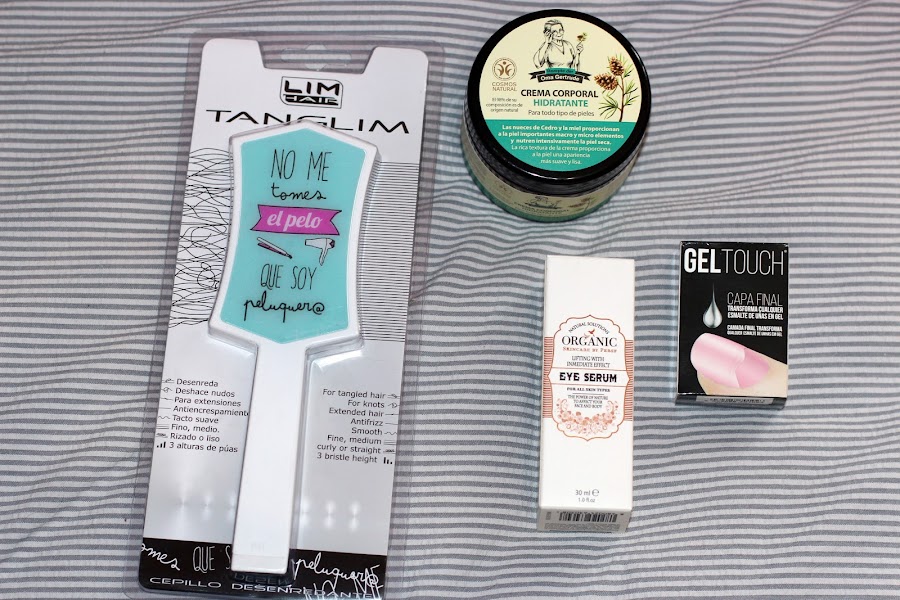 De cosmética me han regalado un cepillo antitirones (lo necesitaba de verdad), una hidratante corporal hecha de ingredientes naturales, un serum para el contorno de ojos y el gel touch. Aquí no me voy a parar mucho porque os iré haciendo reviews a medida que vaya probado los productos.
