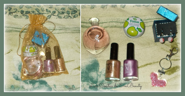 Contenía la colonia Ode a lamour de Yves Rocher, dos pintauñas en tono dorado y violeta claro, una vaselina con aroma a manzana, unos pendientes que me encantaron con unas bolitas blancas y una rosa roja en el centro y un llavero friends, jejeje, con forma de corazón con purpurinas rosas.