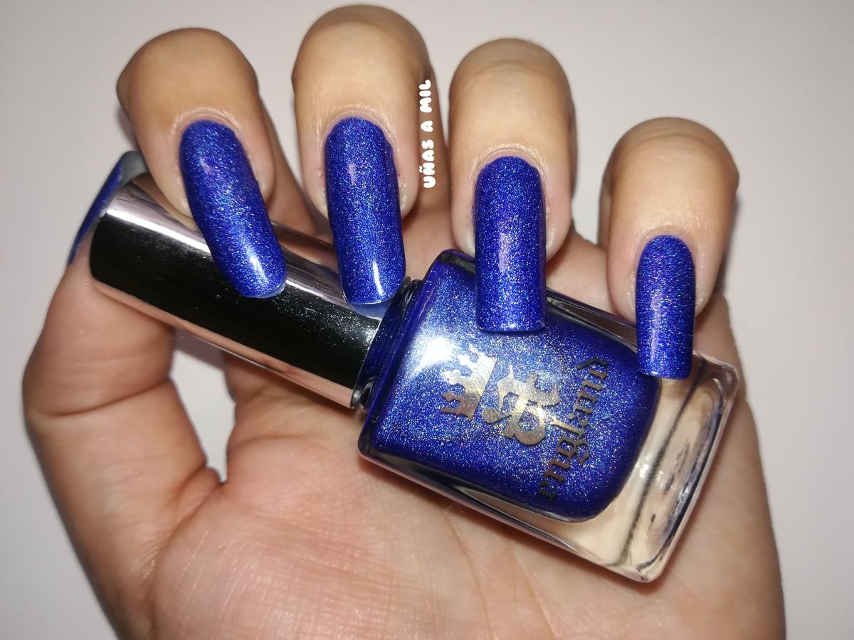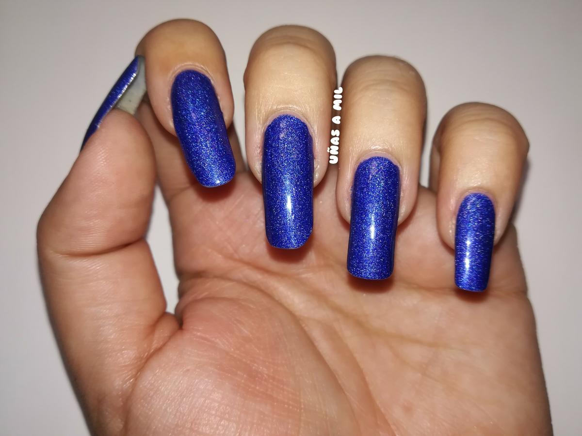 Ahora llevo las uñas muy cortas chicas…se me han ido rompiendo y estaré un tiempo cuidándolas…así que de momento los voy a guardar en el mejor rincón de mi estantería, pero sí que me ha dado tiempo a estrenar el esmalte de A-England y no puedo estar mas contenta con él…aparte de lo precioso que es con ese efecto holográfico, es muy cubriente y cremoso.