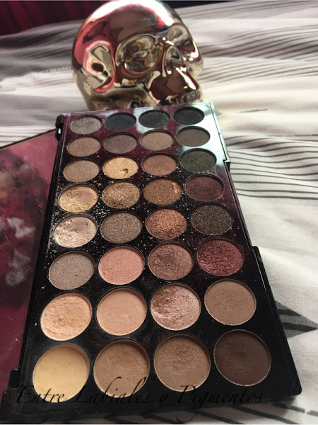Es una paleta de 32 sombras, algunas mate y otras con glitter e irisadas, con colores básicos neutros y otros para hacer ahumados.