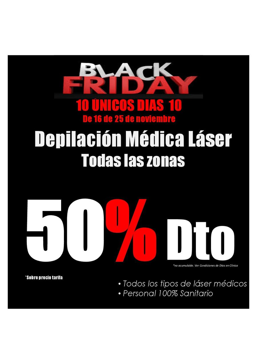 Si estás pensando en someterte a un tratamiento de depilación láser para dejar de preocuparte de forma permanente por el incómodo vello, ¡Aprovecha el BLACK FRIDAY,! En esta fecha, ya tan señalada en nuestra agenda, disponemos de ofertas específicas que te ayudarán a conseguir el mejor tratamiento, con profesional médico especializado, a un precio menor de lo habitual: