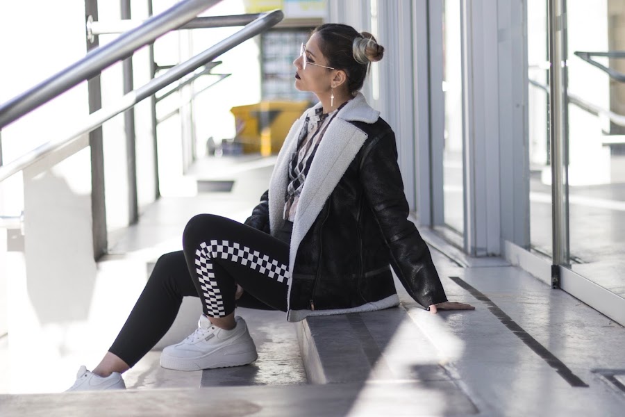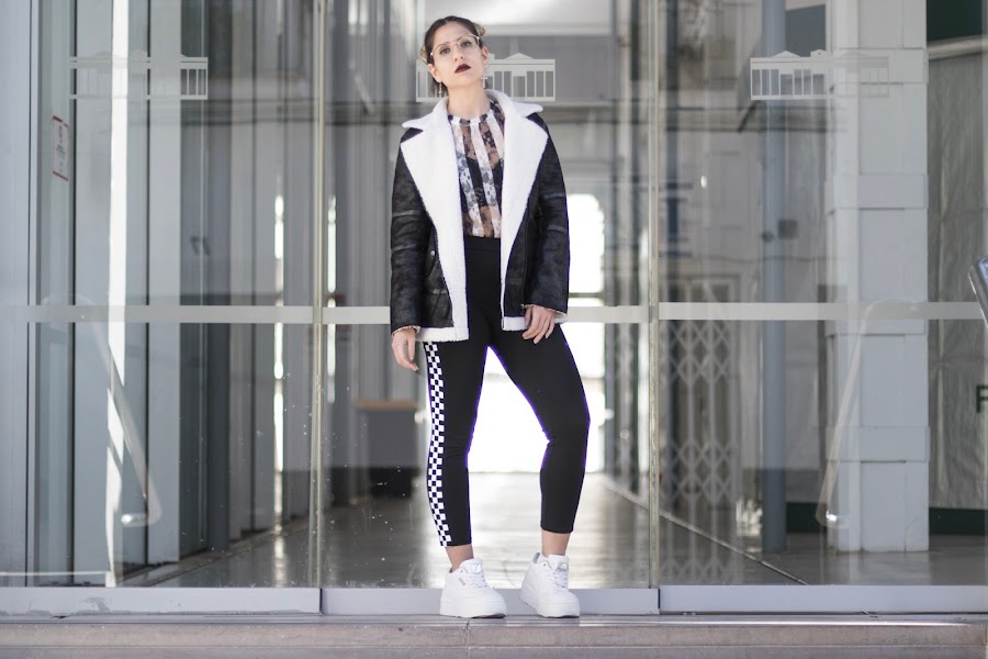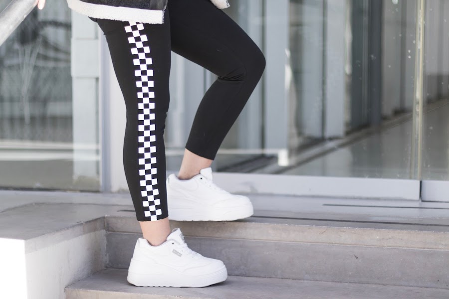 Hoy os traigo un look en blanco y negro con un top de rayas transparente y unos leggings negros con detalles de cuadros en los laterales. Ambas prendas son de SHEIN y es que me encantan!