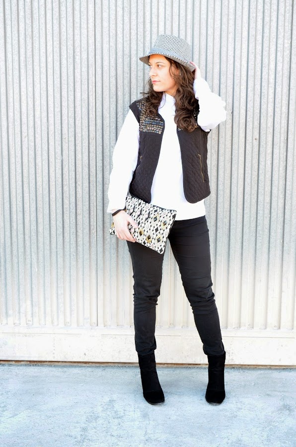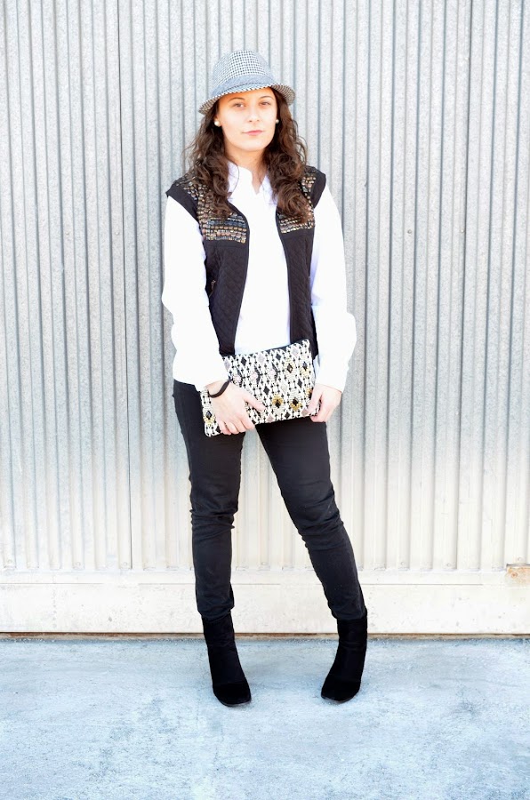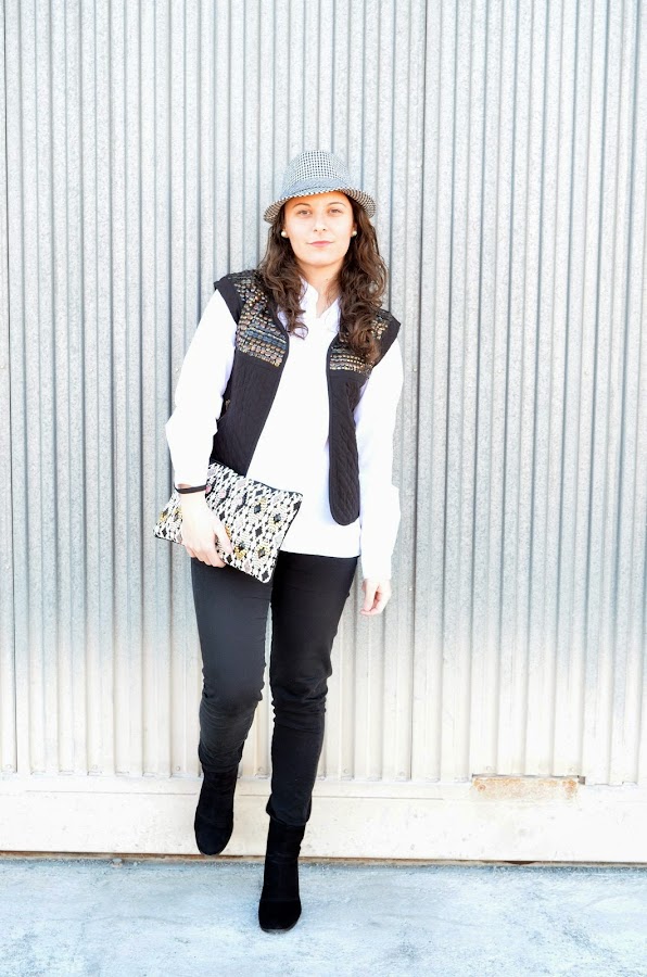 Esta semana me parece que en mis looks no va a faltar un sombrero. Con el viento que hace últimamente es una de las formas de poder el llevar el pelo suelto sin que parezcas una loca. El look que os muestro hoy es el que llevé ayer domingo. Salió un día estupendo, muy soleado y con temperaturas muy buenas, todo ello a pesar el viento. No hacía falta llevar abrigo así que opté por un look cómodo con básicos como una camisa blanca y unos pantalones negros. Para darle un toque distinto e ir un poco más abrigada me puse un chaleco acolchado con detalle de tachuelas en la parte delantera. ¿Qué os parece el mix de este look?