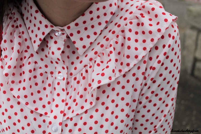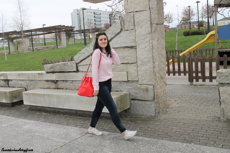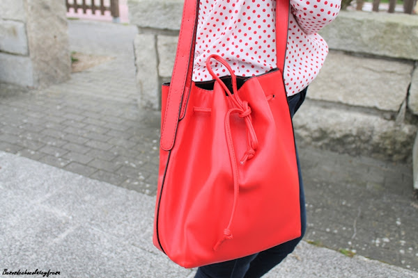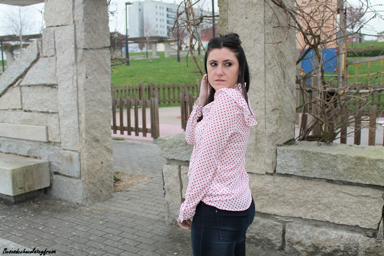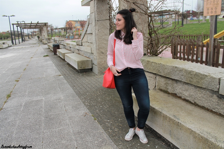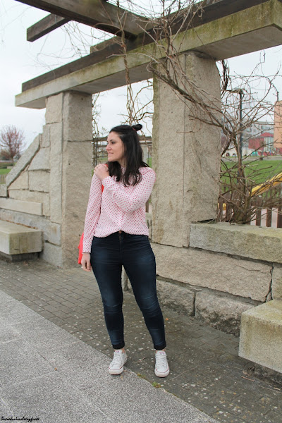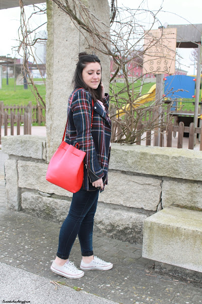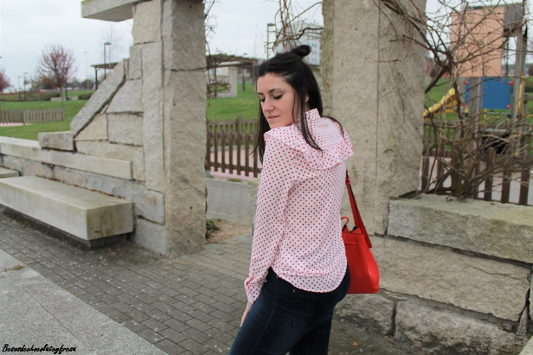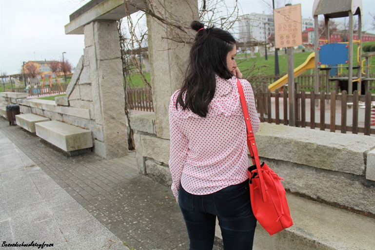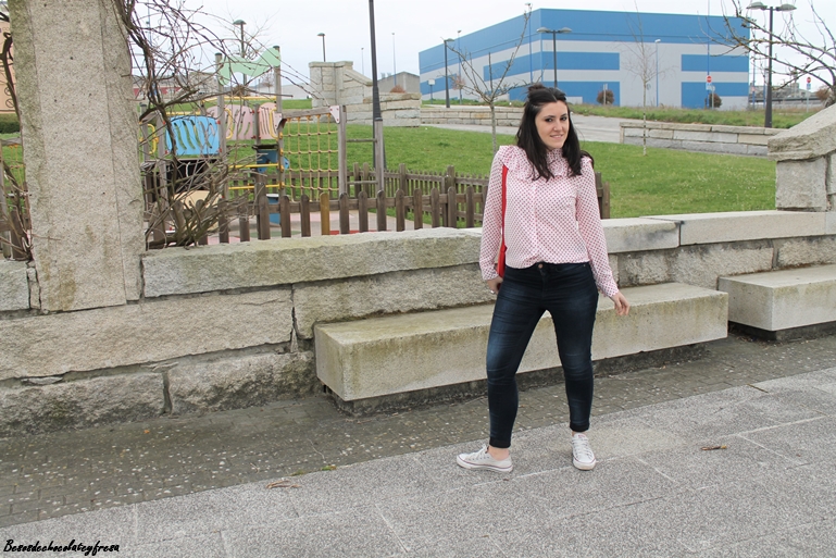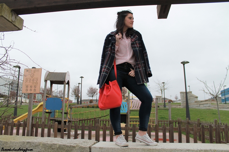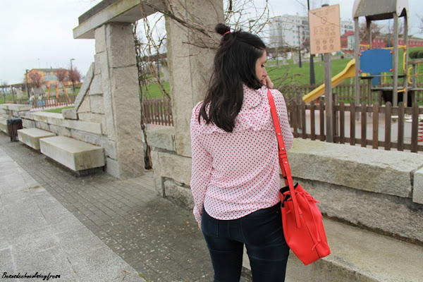 Para una jornada de trabajo y de ir de un lado para otro decidí apostar por un look cómodo y abrigado, pues las temperaturas han bajado de repente, hasta el punto de llegar la nieve...Llevo camisa de lunares en rojo con volantes en los hombros, pechera y espalda que podéis encontrar en Besosdechocolateyfresashop, jeans oscuros, converse, bolso bombonera en rojo y abrigo tartan en azul marino y toques de rojo.