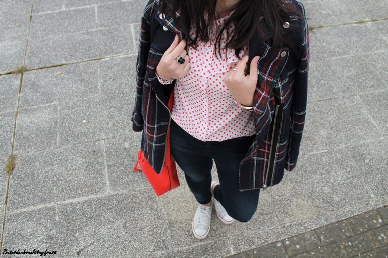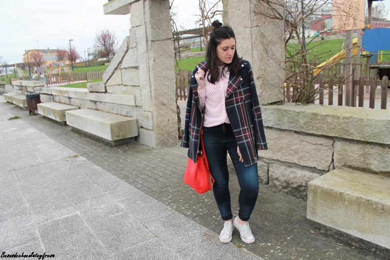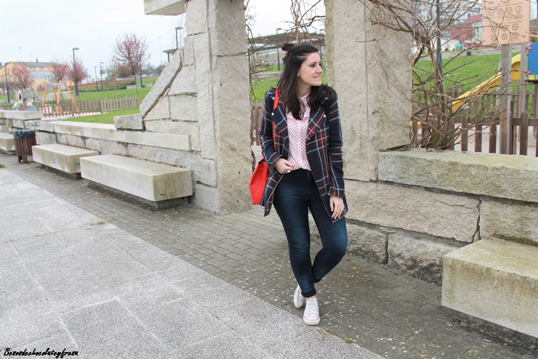 Creo que la moda es a veces para arriesgar y me parece divertido combinar dos estampados diferentes y jugar con ellos, pues dan personalidad, como el caso del estampado de lunares y el estampado tartan.