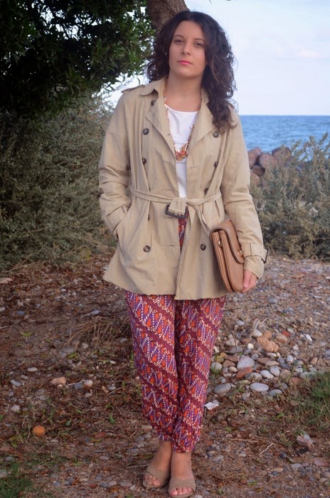 ¿Qué pensáis de mezclar en cuestiones de moda? Yo no soy muy atrevida la verdad...pero con este tiempo tan raro cualquiera sale decente a la calle. El otro día os comentaba sobre el boom de los trench, y es que es una prenda imprescindible esta temporada, queda bien con cualquier cosa, y sino atentos al look de hoy. Os propongo un mono de la temporada de verano, sí, es veraniego, pero sinceramente en verano pocas veces me pongo pantalón largo, por no decir que nunca, así que lo utlizo ahora este "veroño". Como es muy colorido, en tonos naranjas y lilas, lo he combinado con sandalias y bolso en colores neutros para no quitarle protagonismo. Para el frío de las mañanas y las tardes-noches, mi trench, que desde hace unsas semanas me acompaña casi todos los días. ¿Qué os parece el look de hoy?