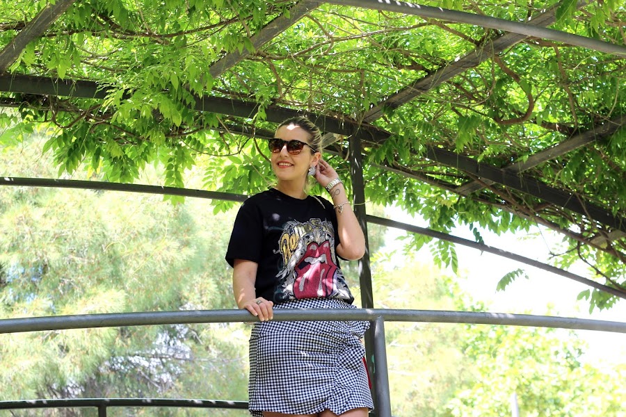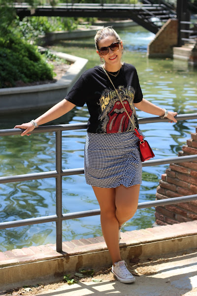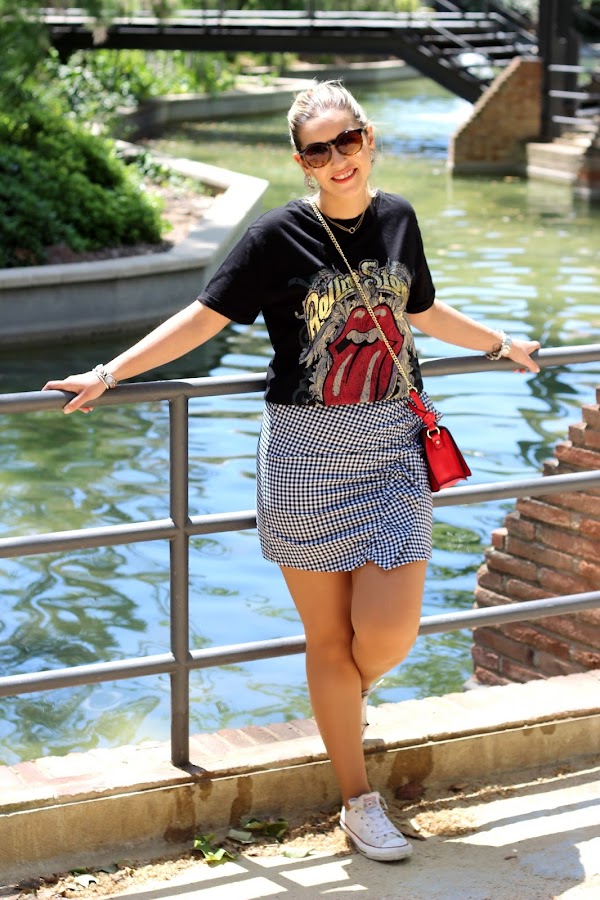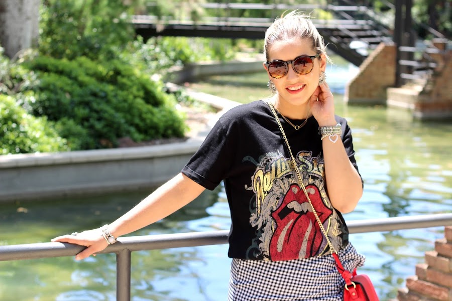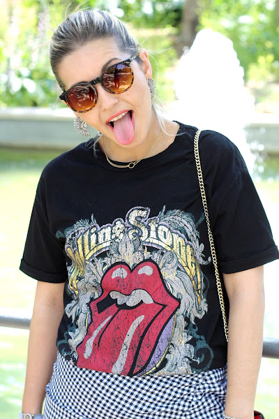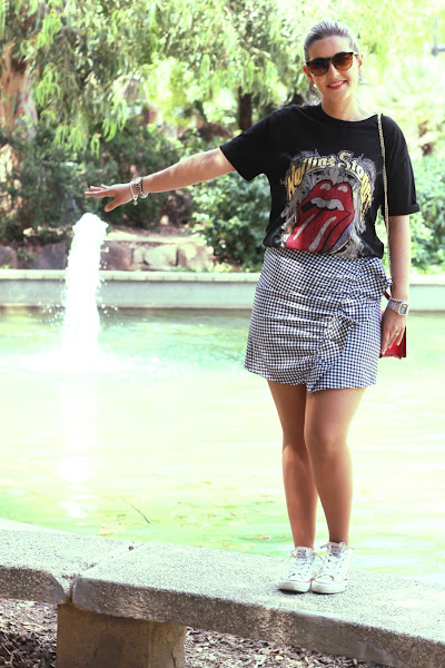 Hoy os traigo un look un poco diferente a lo que os tengo acostumbrados, ya que es un mix de estilos. Me puse mi falda de cuadros vichy con volante, que me parece super femenina y dulce, que combiné con una camiseta rockera de los Rolling Stones, que se llevan mucho esta temporada. Los accesorios del look fueron mis Converse y mi bolsito rojo. Un look casual chic con un toque rockero que me encanta para el fin de semana.