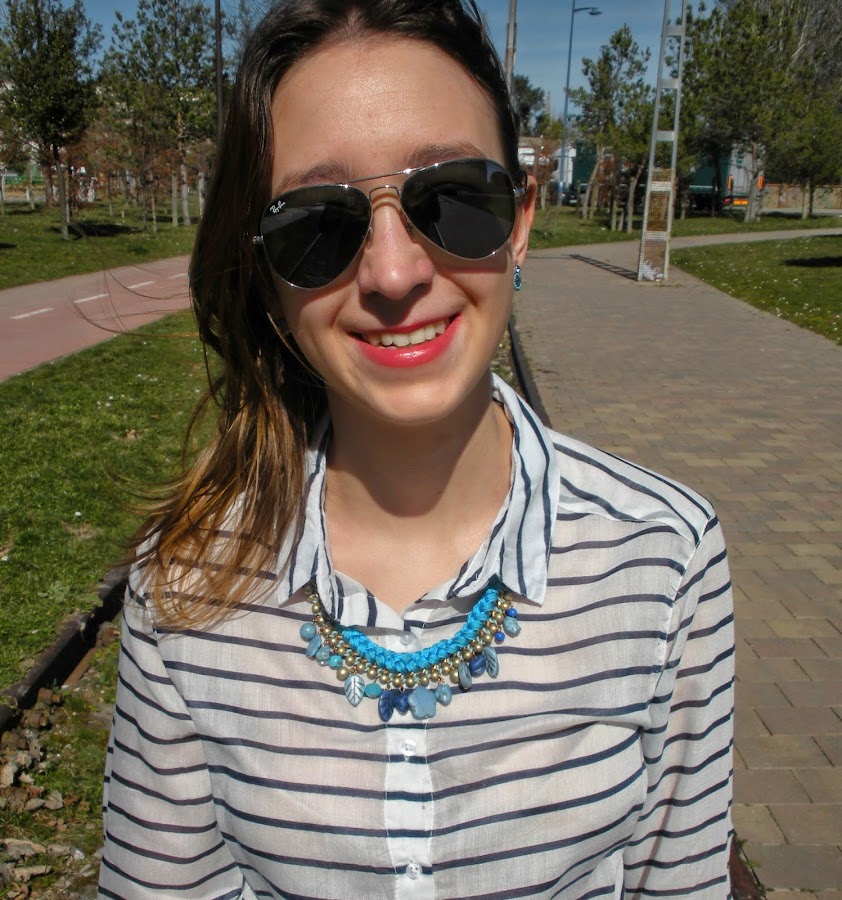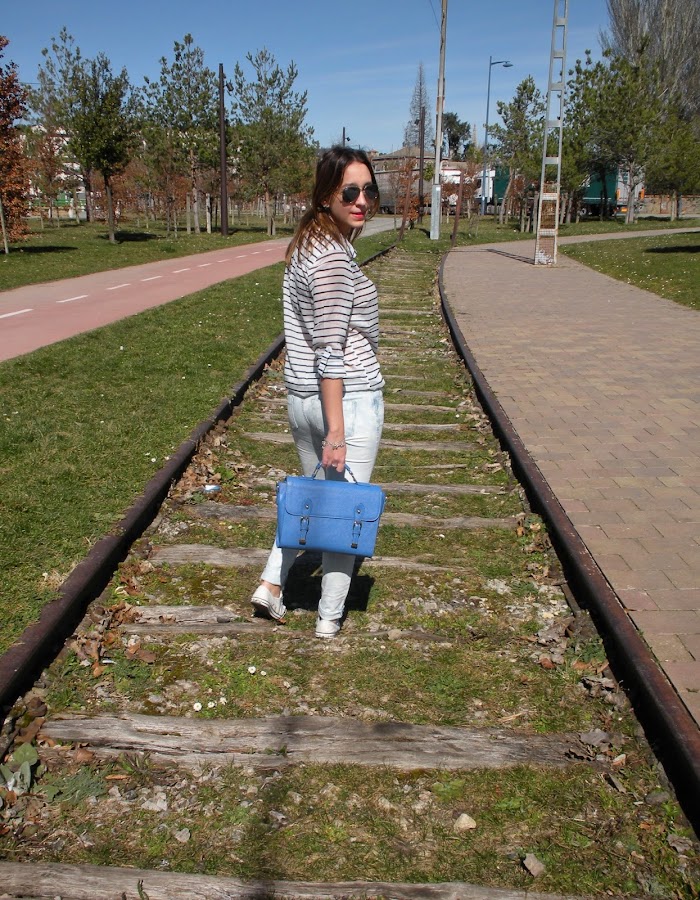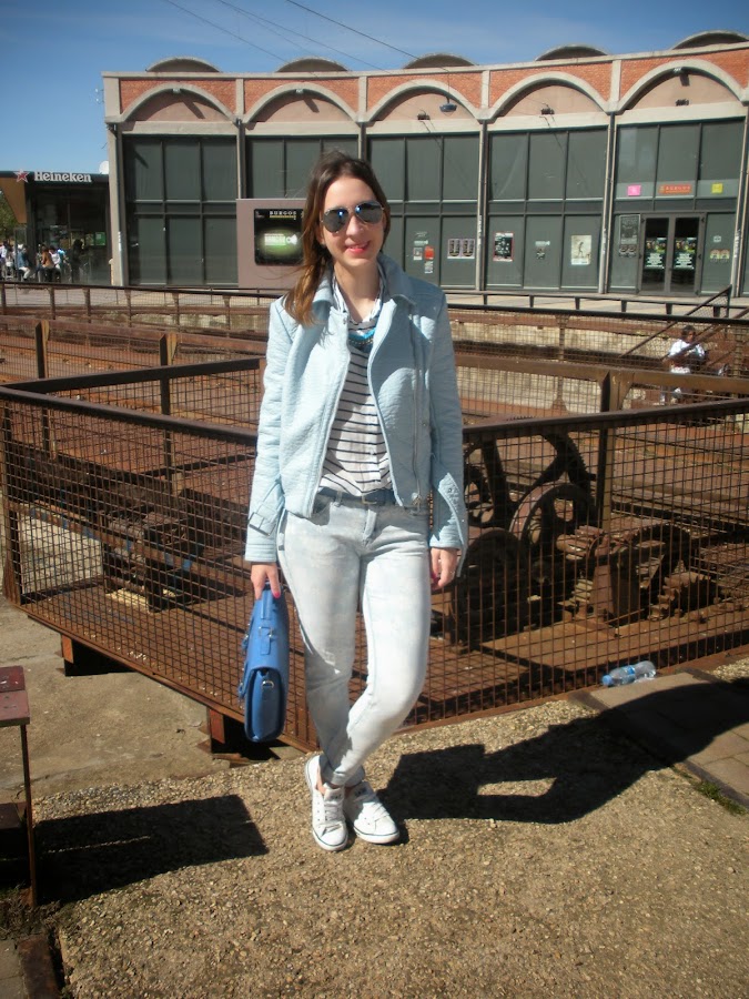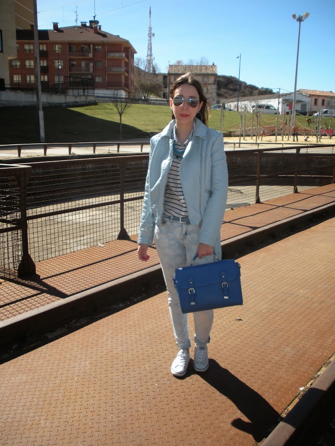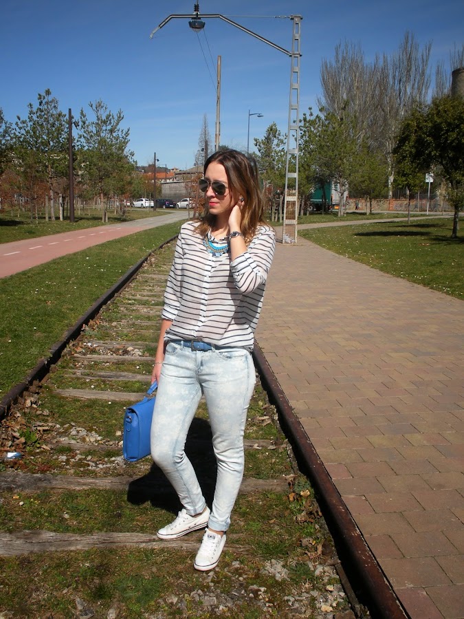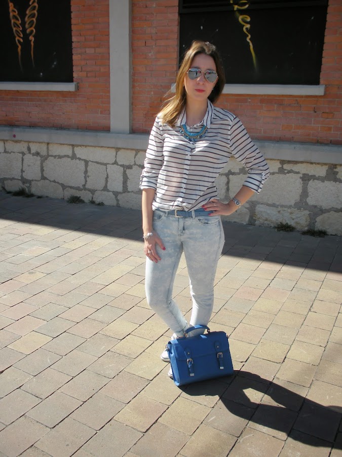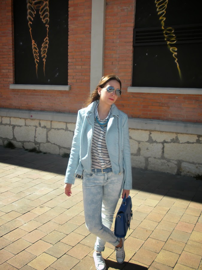 Hoy os traigo un look muy primaveral con un mix de estampados: las flores y las rayas, todo en la misma gama de colores: azul y blanco. Tenía unas ganas locas de estrenar esta biker que llevaba un mes en el armario y mi nueva camisa navy así que opté por estos jeans estampados que me encantan.