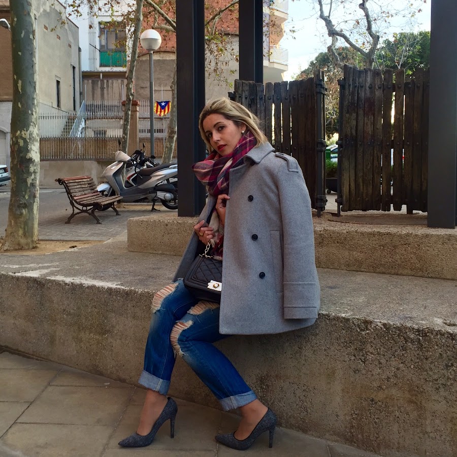 Today I show you a chic casual outfit that its the kind of outfits that I love. In the outfit of the day, I wore boyfriend jeans with a navy tee with plaid scarf, a mix of prints that seems difficult but in this case, the mix is perfect and give a special touch to the outfit. The others clothes of the outfit were my new grey coat, stilettos and my black bag similar to Chanel.