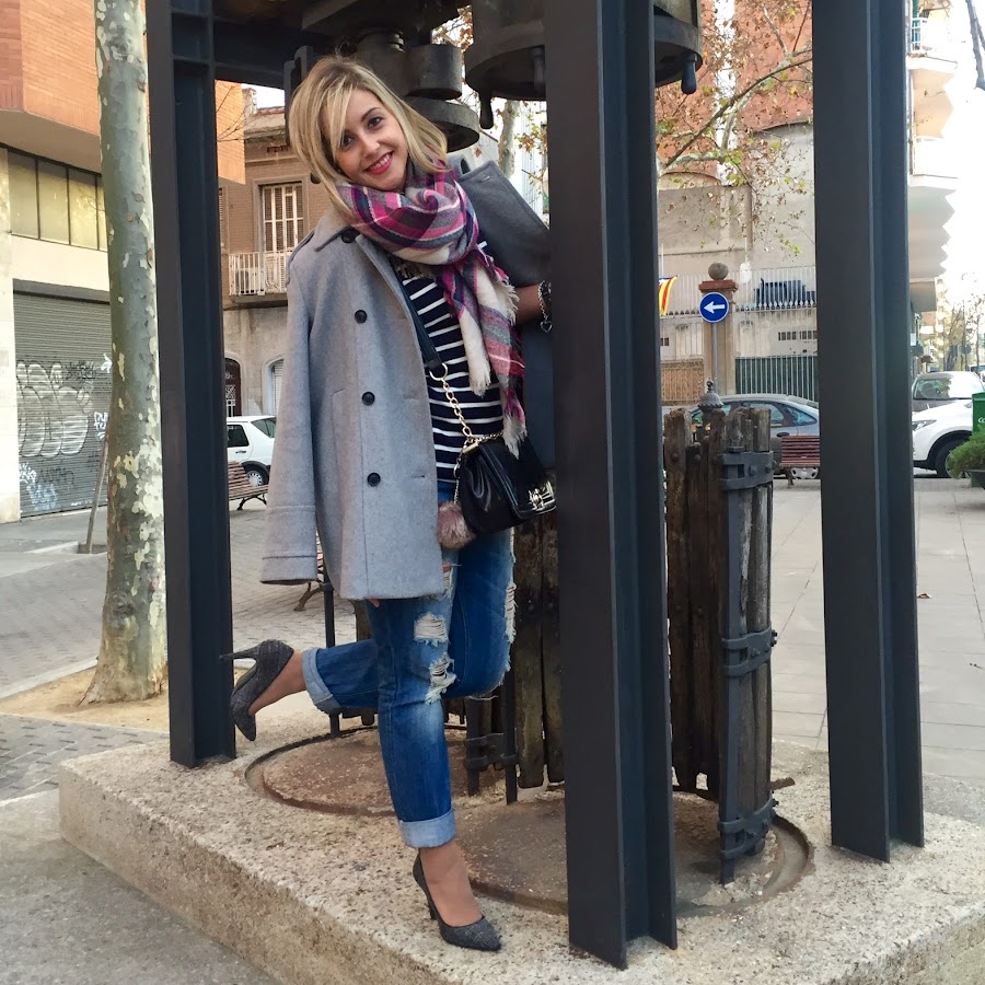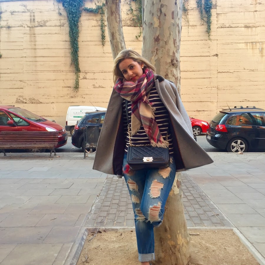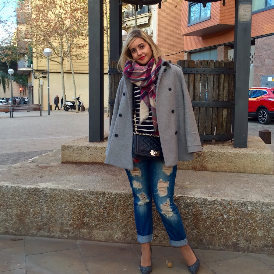 Hoy os enseño un look casual chic que son el tipo de looks que más me gustan. En el look de hoy, llevo boyfriend jeans que combiné con una camiseta de rayas con bufanda de cuadros, una combinación de estampados que parece arriesgada, pero que en este caso, combinan a la perfección, dándole un toque al look. El resto de prendas del look, mi nuevo abrigo gris, stilettos y mi bolso negro estilo Chanel.