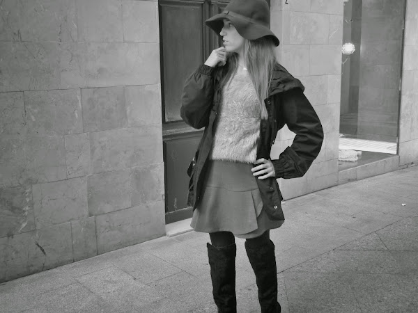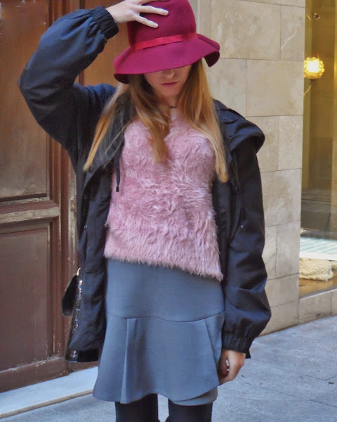 Por lo demás, es bastante sencillo: falda gris de Stradivarius (new), aunque está este mismo modelo en H&M también; jersey rosa de Easy Wear (new), cómodo, cortito calentito y tan tendencia las prendas de pelo últimamente que no me puede gustar más; y sombrero de ala burgundy de Stradivarius, dando el toque chic al look. ¿Cómo terminar de rematarlo? Sin duda con unas buenas botas hasta la rodilla y un trench corto, como es mi caso.