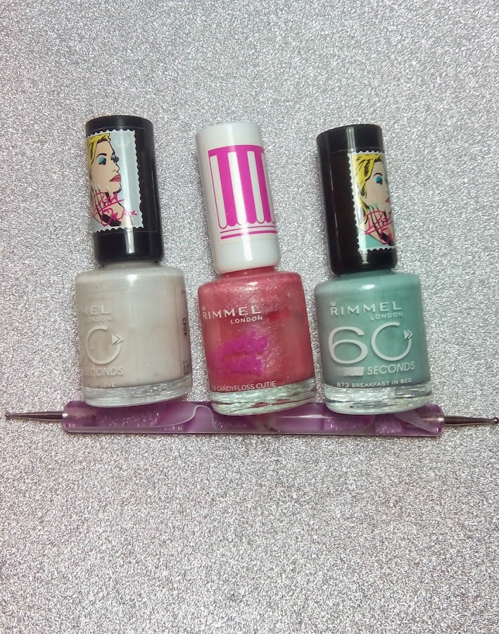 Así que, entre apuntes y apuntes, utilicé los siguientes esmaltes de secado rápido y me puse manos a la obra: