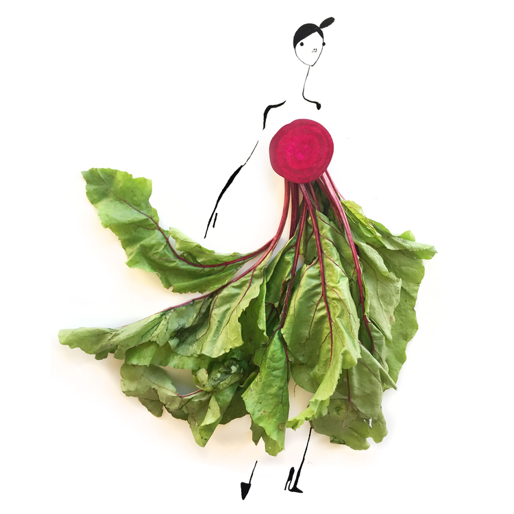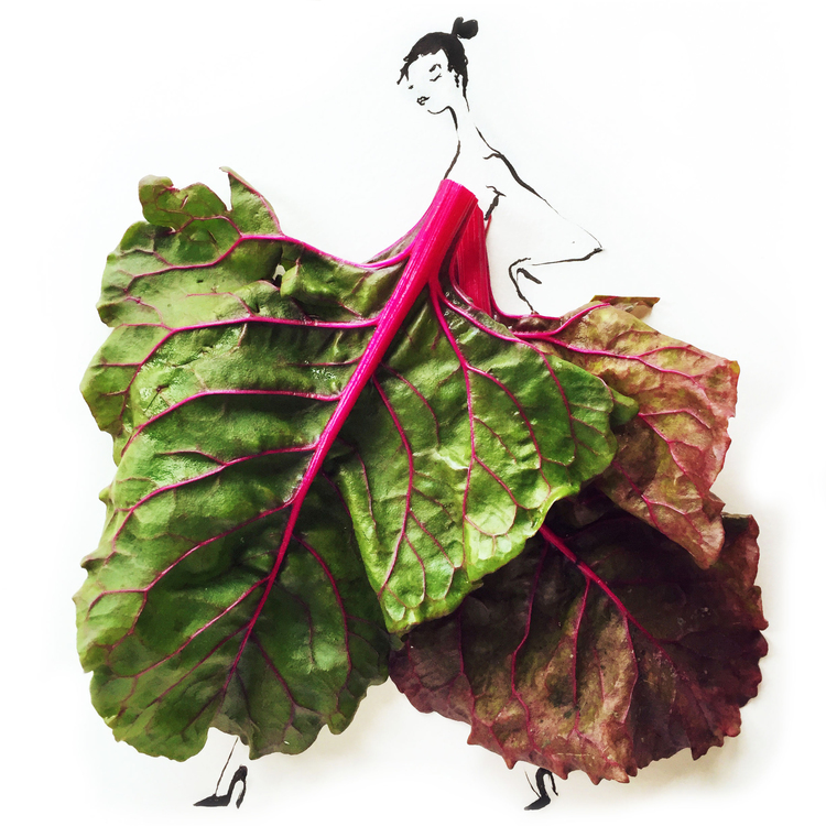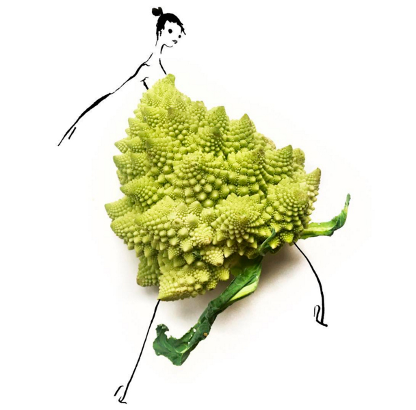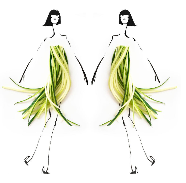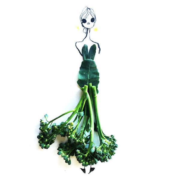 ¿Alguna vez de pequeño te han dicho que no se juega con la comida? Pues a Gretchen no debían de decirle lo mismo, porque a lo que se dedica es precisamente a esbozar sketches que entremezclan moda y alimentos. Y parece divertirse haciéndolo, claro que sí: ¿un mono largo de plátano?, ¿unos bonitos pantalones de vainas?, ¿o un fantástico vestido de corte sirena a base de brócoli? No, Gretchen Röehrs no es una diseñadora de estrambóticas ideas, es ilustradora, y sus sketches aúnan estilizados figurines con diseños de lo más saludables.