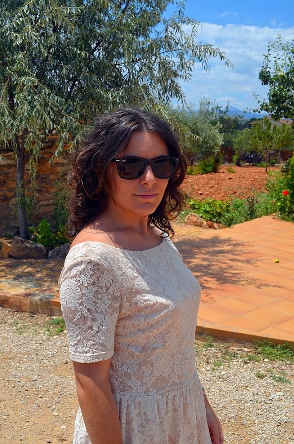 Como teníamos que ir a un pueblecito de montaña,visitar la bodega, ver la finca, caminar por lo viñedos y demás...opté por un look cómodo y fresquito. Elegí un vestido en color rosa palo de encaje con detalle abierto en la espalda, es de Zara del año pasado, pero ya sabéis me gusta mucho reutilizar prendas de otros años en verano. Elegí unas cuñas y un maxibolso para poder llevar de todo!