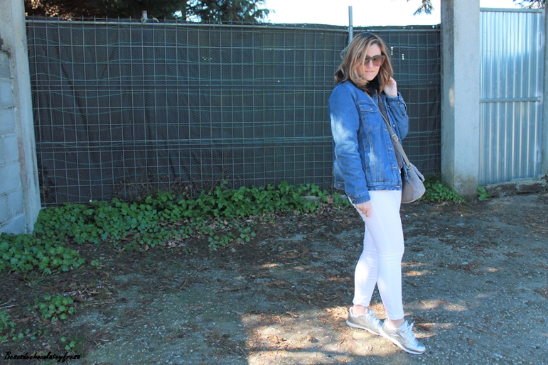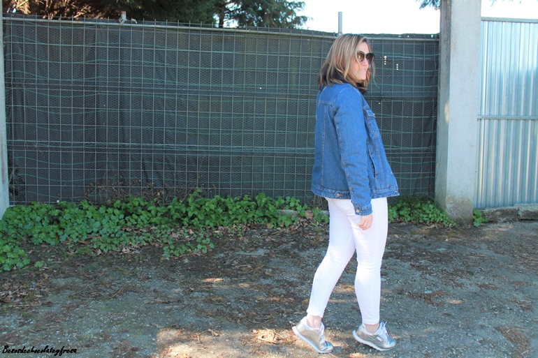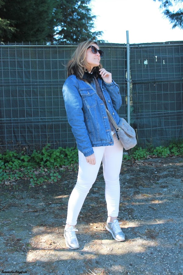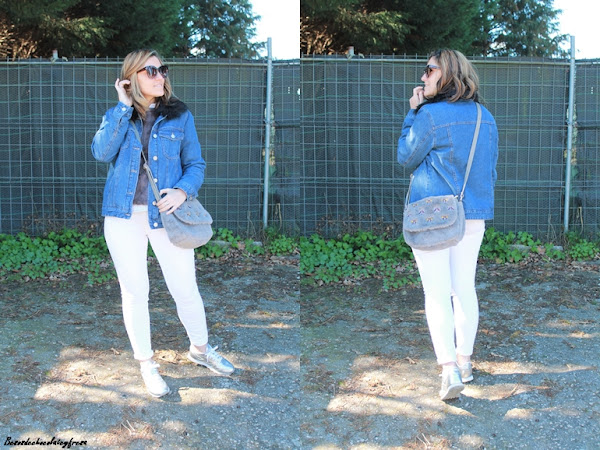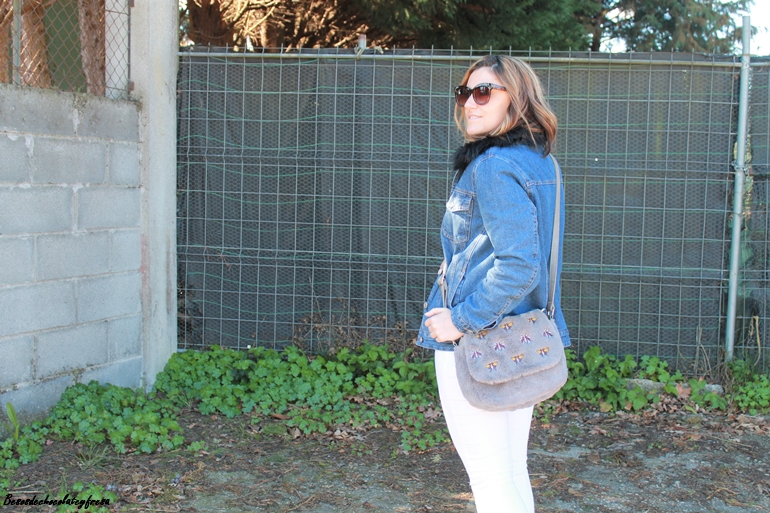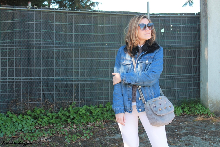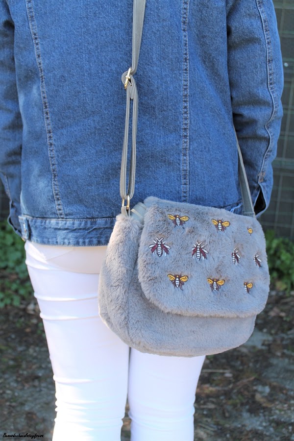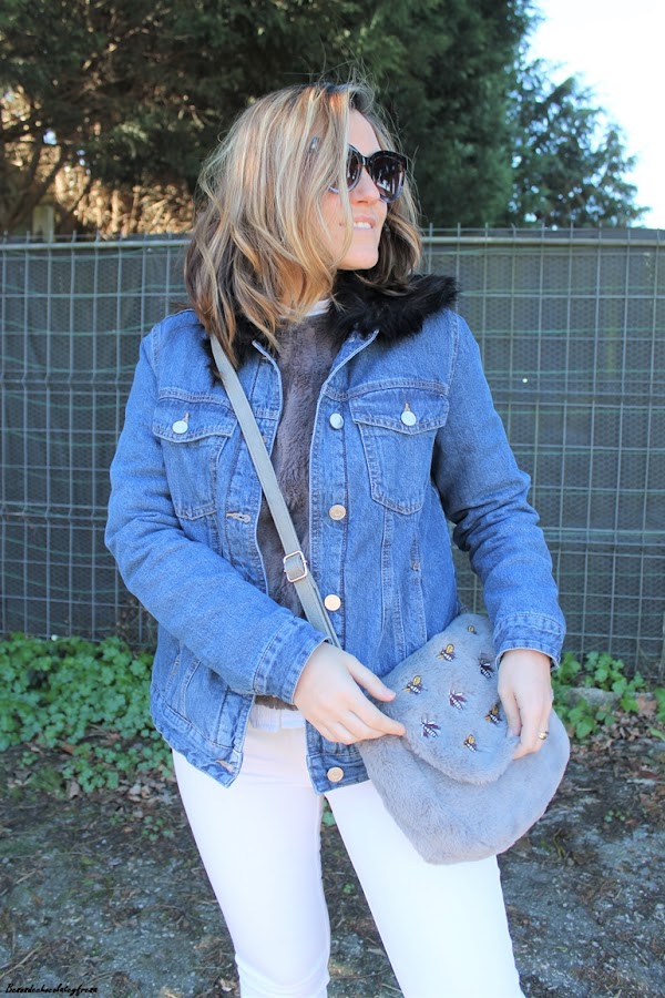En el outfit de hoy os enseño esta tendencia en complementos, el bolso con estampado de bichos, bandolera y en peluche y piel gris. Lo combiné con jeans en blanco, sweater también de peluche con camisa de volantes en el interior, sneakers plateadas y cazadora denim de borreguillo por encima