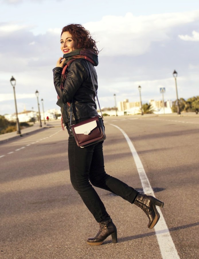 Ya veis que es súper fácil introducir un poco de color en este look de piezas rock: cazadora de cuero, boyfriends jeans negros y botas de cocodrilo.
