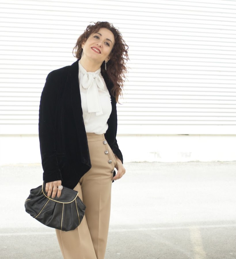 Para estos día aposté por el aire romántico de la blusa plumetti con lazo, una gasa transparente muy chic y neutra para esta combinación. Y de abrigo una preciosa chaqueta de terciopelo negro desestructurada (ganga de las rebajas) un clásico que combina con mil cosas y un elemento muy útil para el fondo de armario.