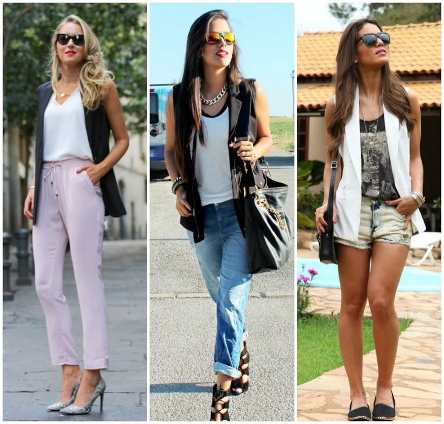 -Blazer con o sin mangas. combínalo con shorts de denim mezclando informalidad con formalidad, otra tendencia reinante, tanto para el día en colores claros como para la noche en estampados y colores fuertes.