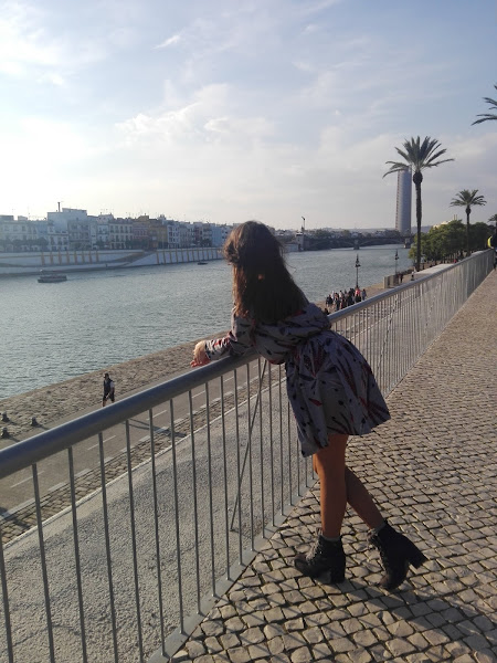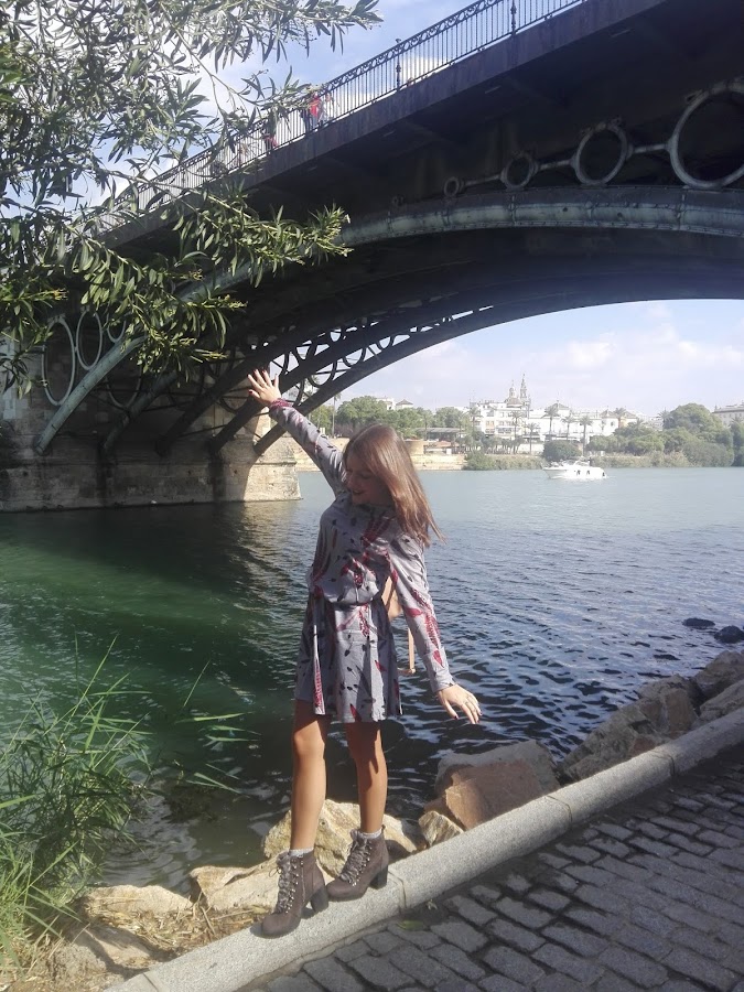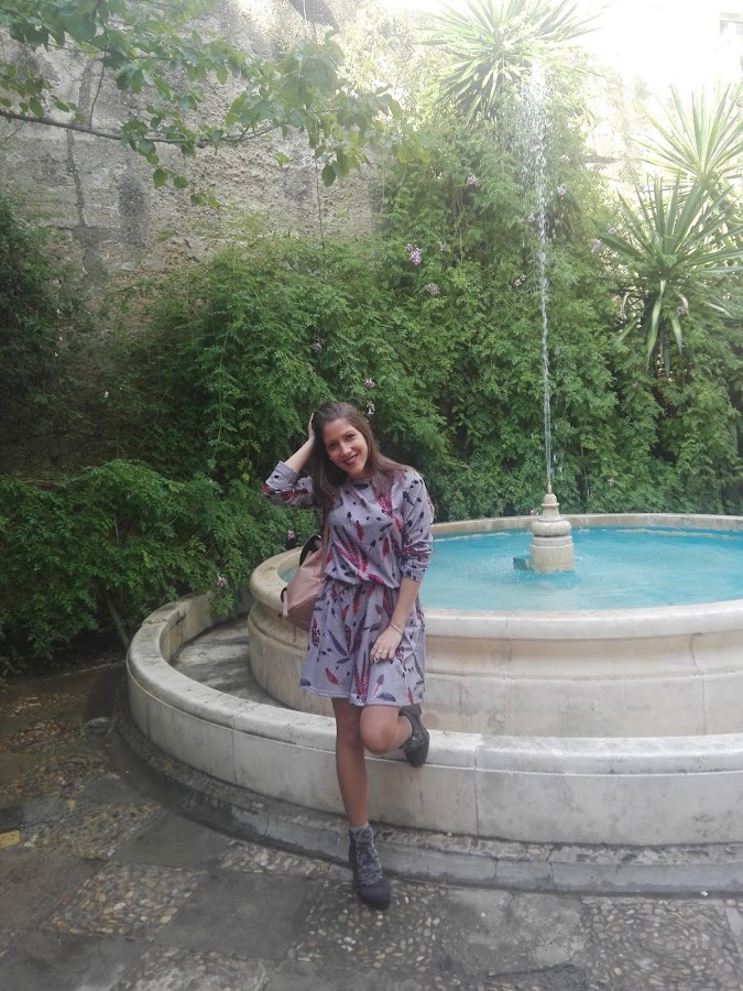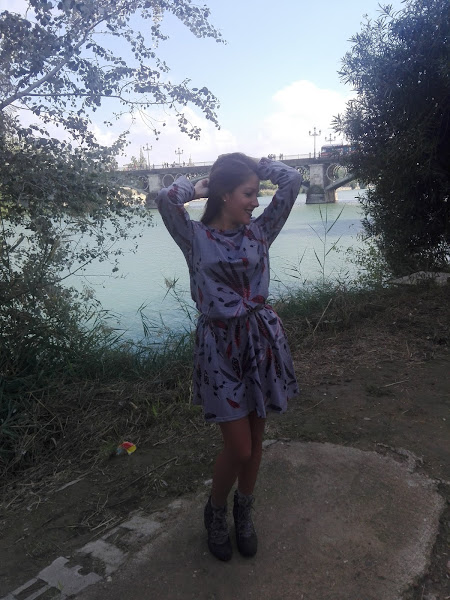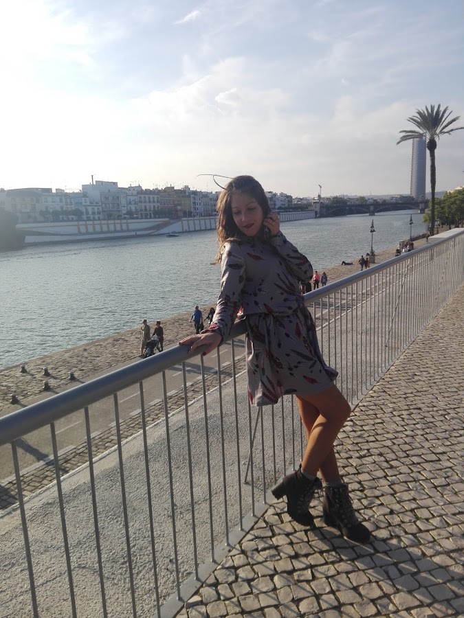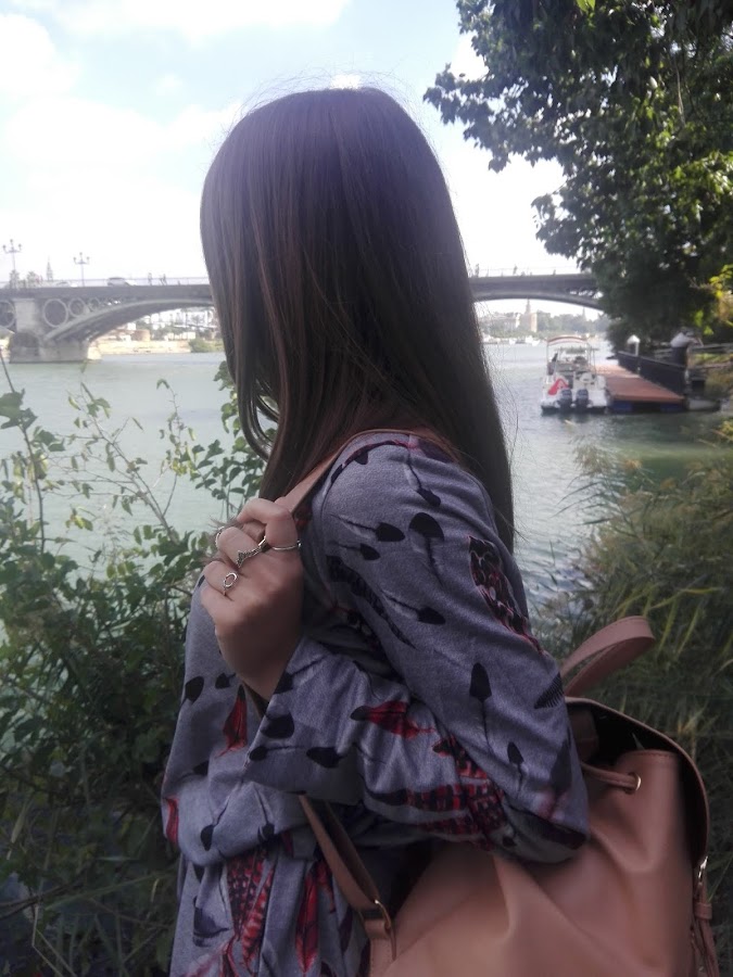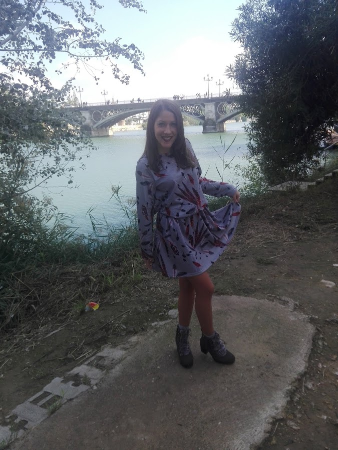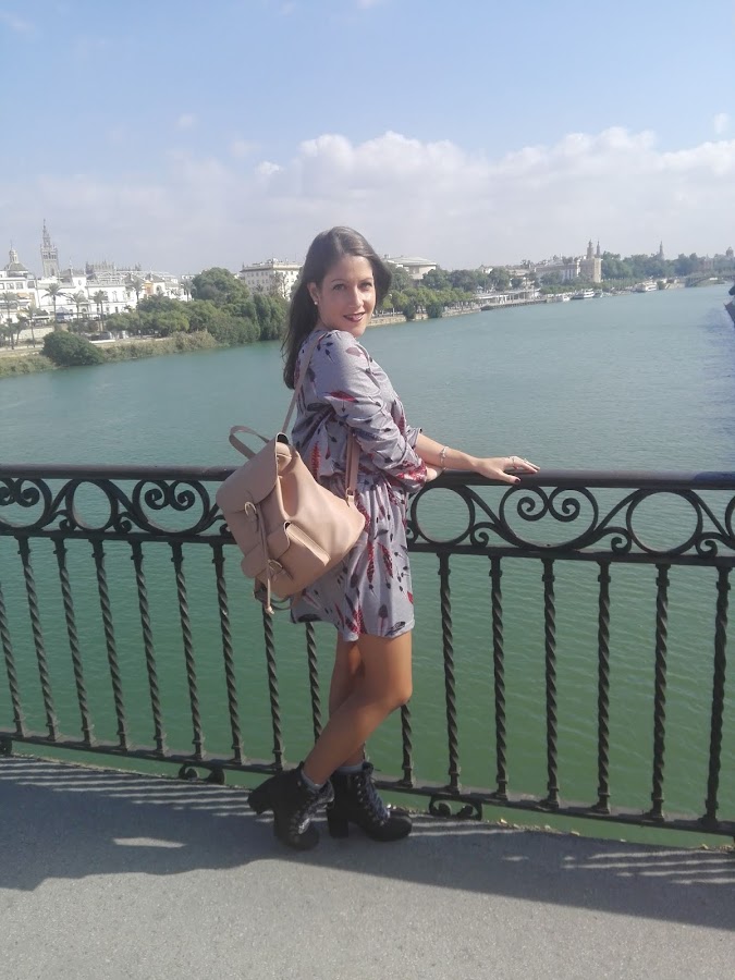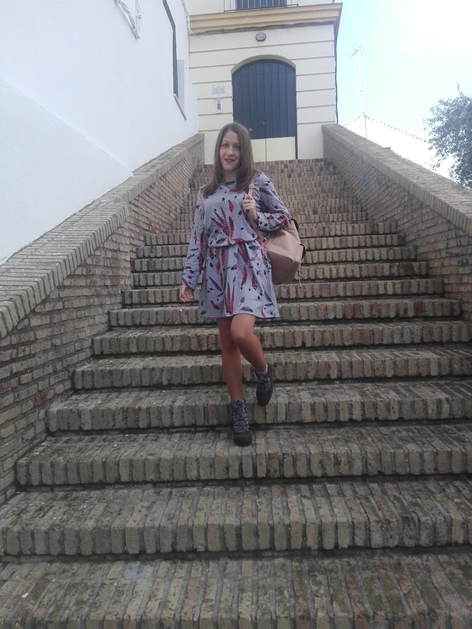 Como por aquí por el sur todavía disfrutamos de un buen tiempo, sin apenas frío y algunas lluvias muy de vez en cuando, en esta ocasión os propongo un look con una tonalidad muy otoñal en el que el protagonista es este bonito vestido de manga larga con estampado de plumas, combinado con unos originales botines grises con detalle de pelito y una mochilita en tonos marrones con el que le daréis un aire boho a vuestro outfit, aunque esta última podéis sustituirla por un bolso negro si queréis un look más formal.