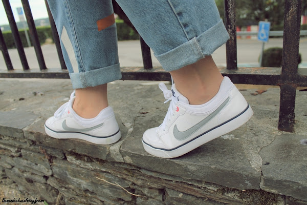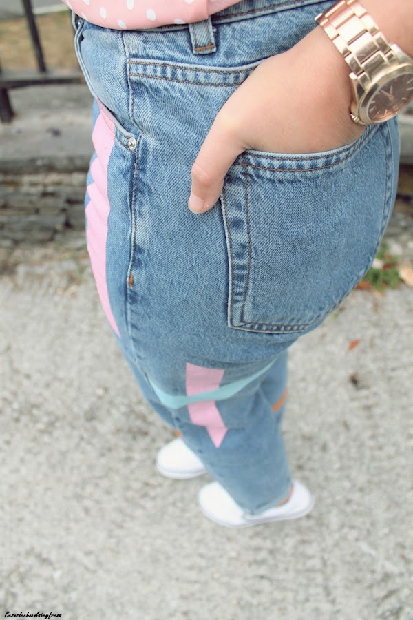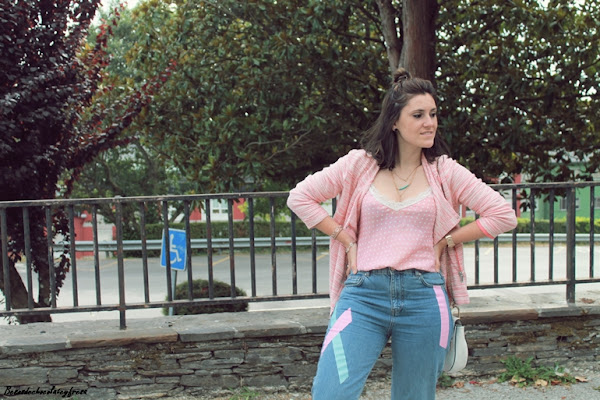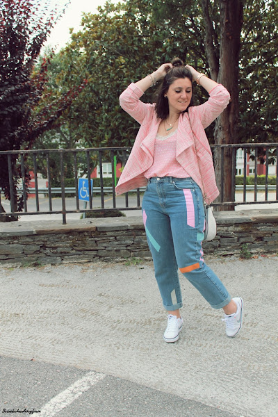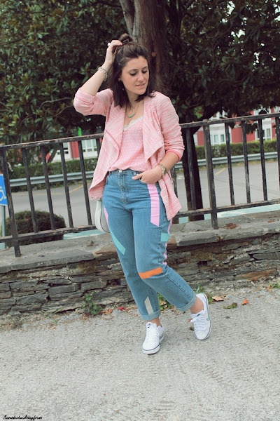 Los mom-jeans vuelven con fuerza y ante la curiosidad de esta tendencia, no me pude resistir cuando vi los pantalones que llevo en el outfit de hoy en Pull&Bear, que ahora podeis encontrar de rebajas. Además de los característico de los jeans tienen un añadido como son una serie de tiras de colores pintadas a mano en rosa, mint y naranja que lo hacen diferente, original y divertido.