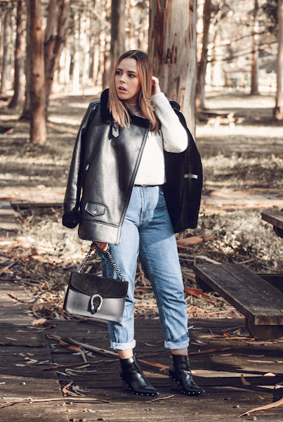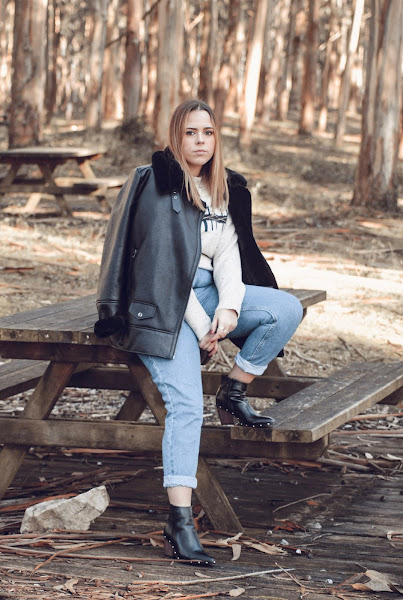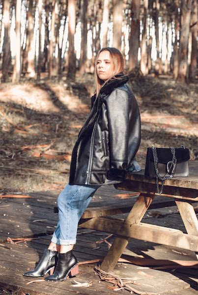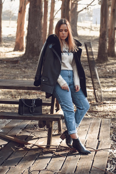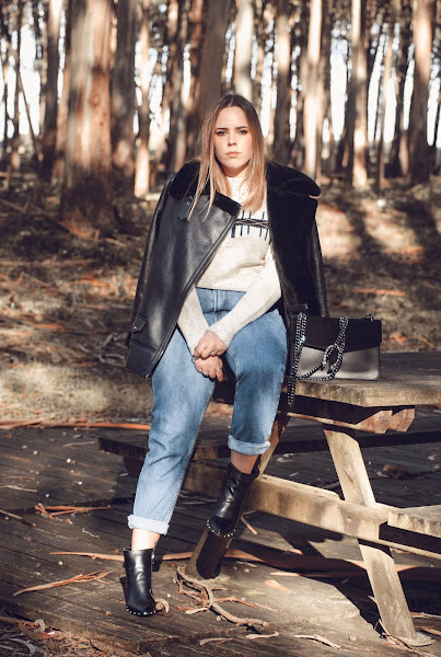 Para ello elegí este look super casual. Mom jeans de hace mil años (que me encantan y no me canso de usar), jersey y botines camperos de Noracora (amo esa web, todo es demasiado bonito), uno de mis bolsos favoritos que me traje de Praga y biker con pelito. Llevaba mil años detrás de una chaqueta de este estilo y este año mi rey mago particular me la regaló, presiento que la veréis bastante por aquí.