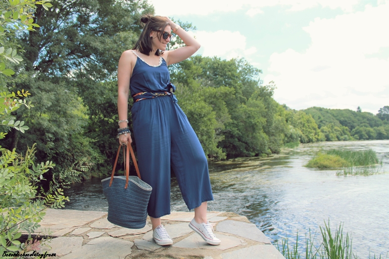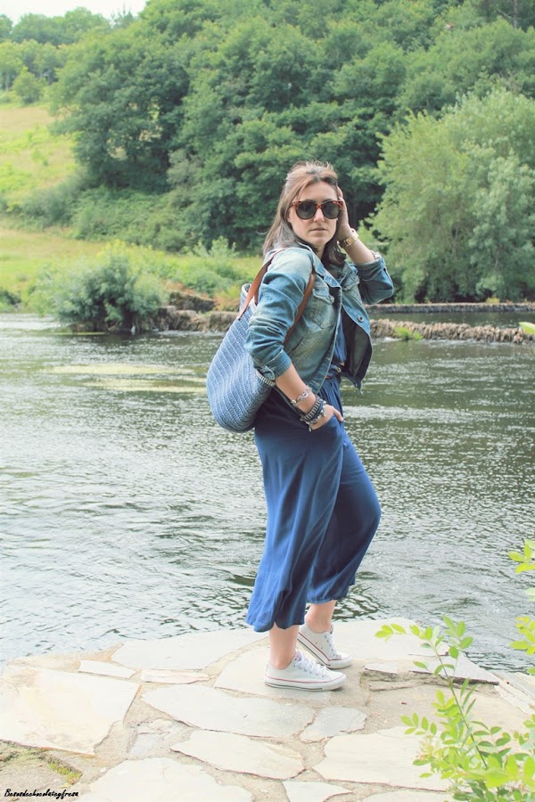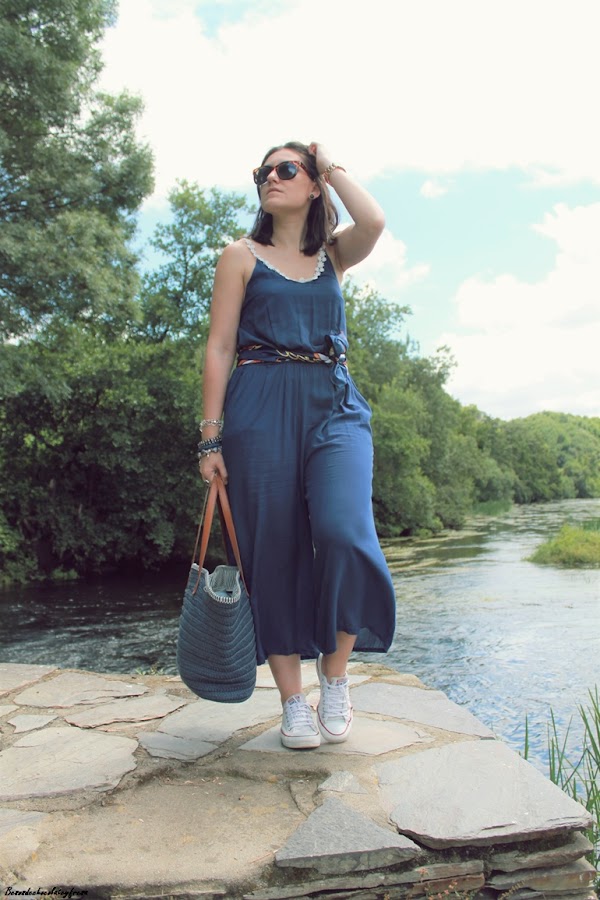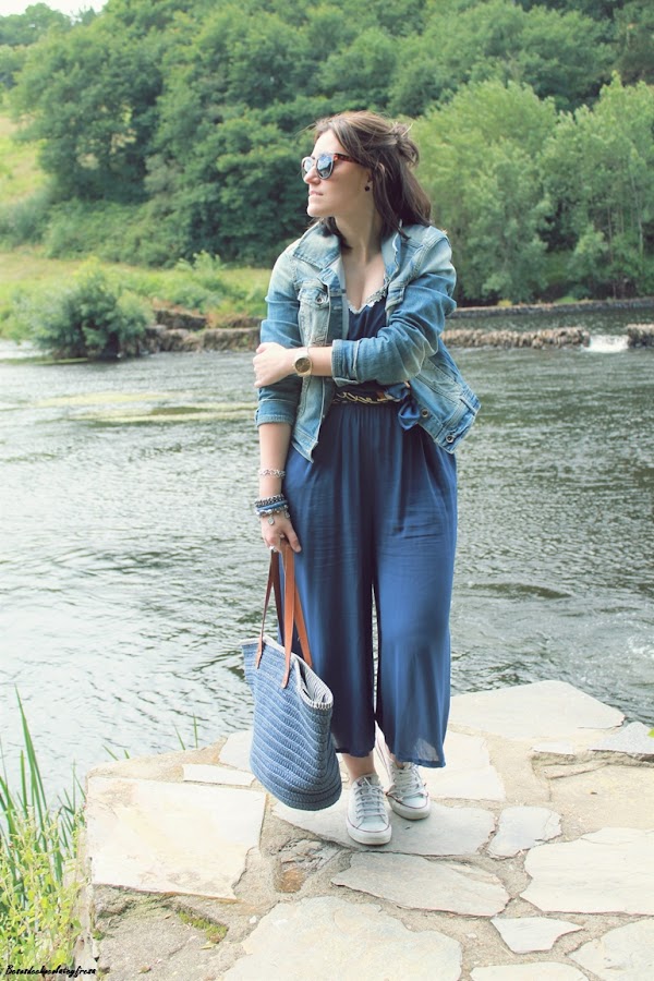 Una prenda todoterreno que podemos ponernos a cualquier hora del día con los complementos adecuados. Para esta ocasión, un video-proyecto especial que grabamos y que saldrá a la luz en los próximos días, decidí apostar por este mono de @besosdechocolateyfresashop con el detalle que tiene en los tirantes en forma de margarita. Holgado y fresco con pantalones tipo culotte lo acompañé de pañuelo en azul con motivos vintage a modo de cinturón, cazadora denim, converse y capazo en los mismos tonos.
