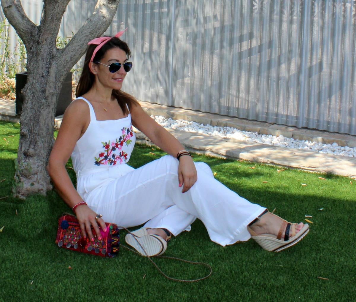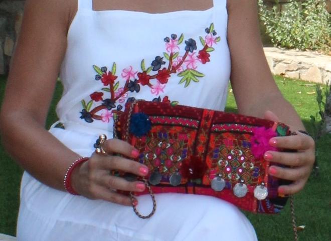 Para completar el look sandalias de cuña, pañuelo anudado a la cabeza y mi bolso banjara con multitud de alegres colores, pompones, monedas que destaca sobre el blanco impoluto del conjunto.