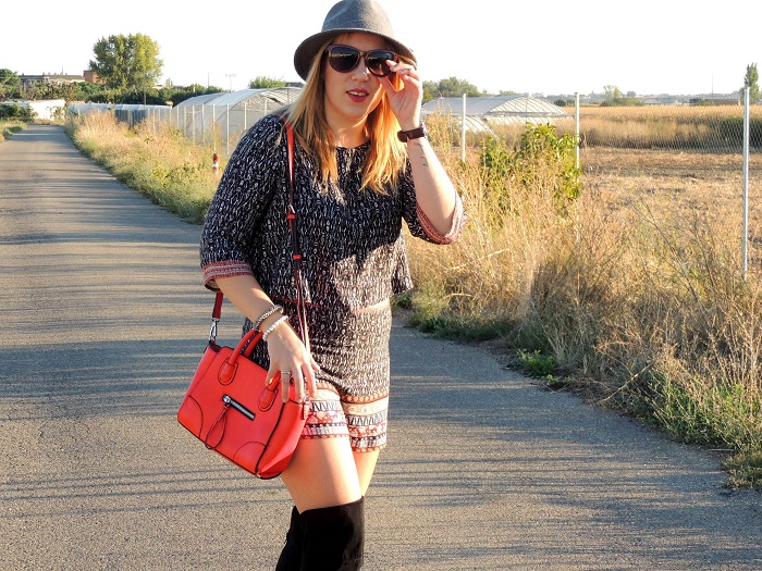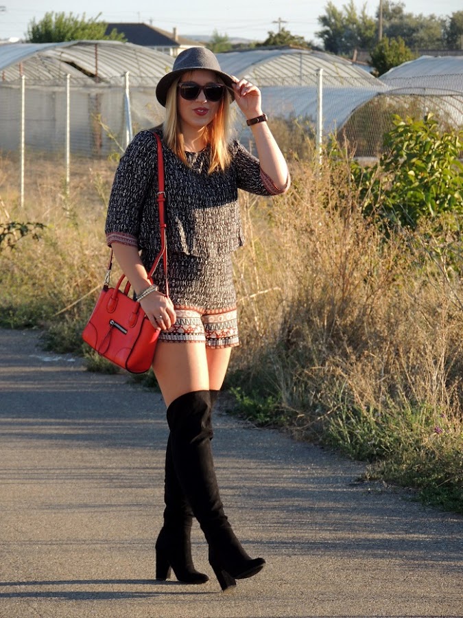 Feliz juernes bonitos! Os traigo un super-look con mis nuevas botas de JustFab, ya os conté el año pasado que estaba como loca buscando una botas como estas y hace un mes JustFab hizo mi sueño realidad. Botas altas, negras, de ante y con un tacón práctico y cómodo, además vienen pisando fuerte esta temporada, así que no puedo estar más contenta con ellas. Aprovechando que aun no hace mucho frío para poner medias, me atreví a llevarlas con este mono otoñal, con un corte espectacular y favorecedor (pero no apto para salir de noche.... el botón y cremallera traseros son un c*ñazooo) el rollazo final lo pone un sombrero (como no?) en tonos grises y contrastando con mi bolso rojo. Espero os guste y feliz finde!!