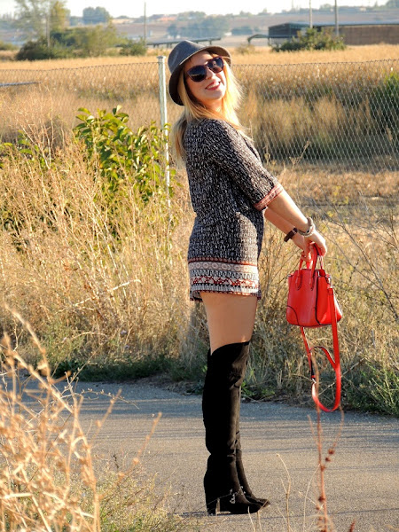 Feliz juernes bonitos! Os traigo un super-look con mis nuevas botas de JustFab, ya os conté el año pasado que estaba como loca buscando una botas como estas y hace un mes JustFab hizo mi sueño realidad. Botas altas, negras, de ante y con un tacón práctico y cómodo, además vienen pisando fuerte esta temporada, así que no puedo estar más contenta con ellas. Aprovechando que aun no hace mucho frío para poner medias, me atreví a llevarlas con este mono otoñal, con un corte espectacular y favorecedor (pero no apto para salir de noche.... el botón y cremallera traseros son un c*ñazooo) el rollazo final lo pone un sombrero (como no?) en tonos grises y contrastando con mi bolso rojo. Espero os guste y feliz finde!!