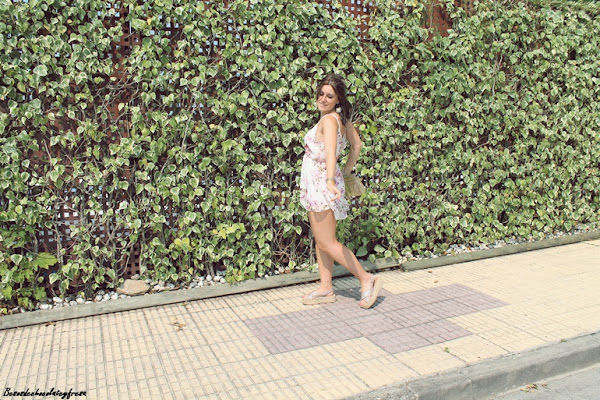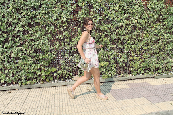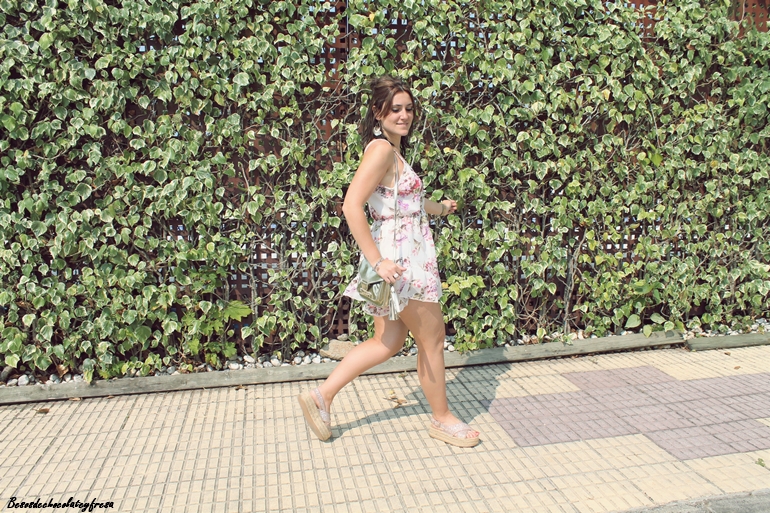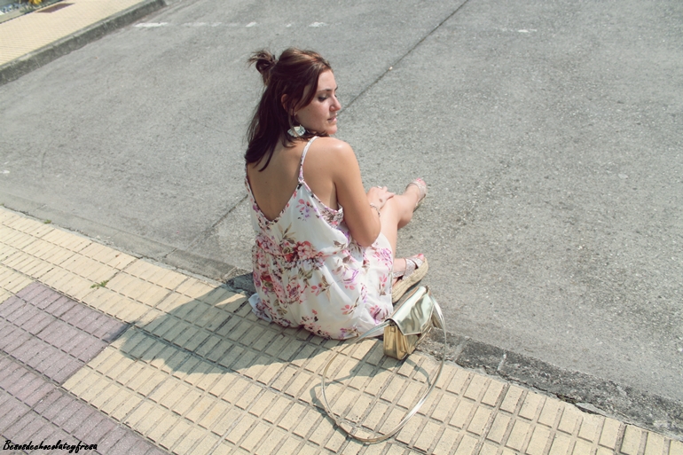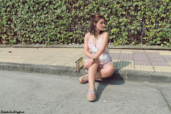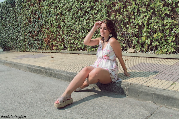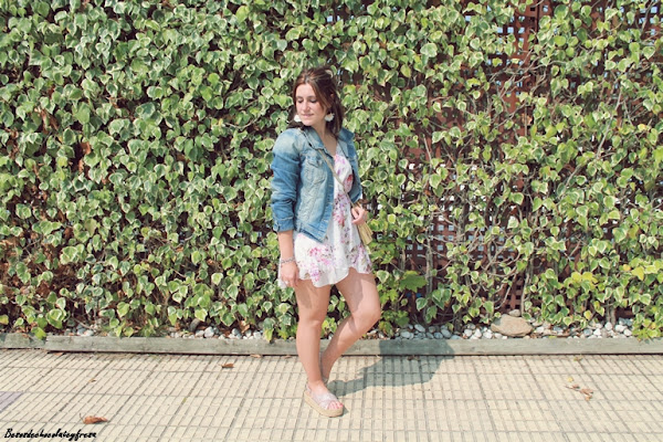 En este ocasión decidí dejar todo el protagonismo en el mono, poniendo pocos accesorios, tan solo unos maxi pendientes de borlas en el mismo tono, blanco crema, sandalias de esparto con brillo en rosas como las flores, bolso dorado y para la tarde-noche una chaqueta denim, que ya hace falta aquí por el norte y no podemos olvidarla en casa.