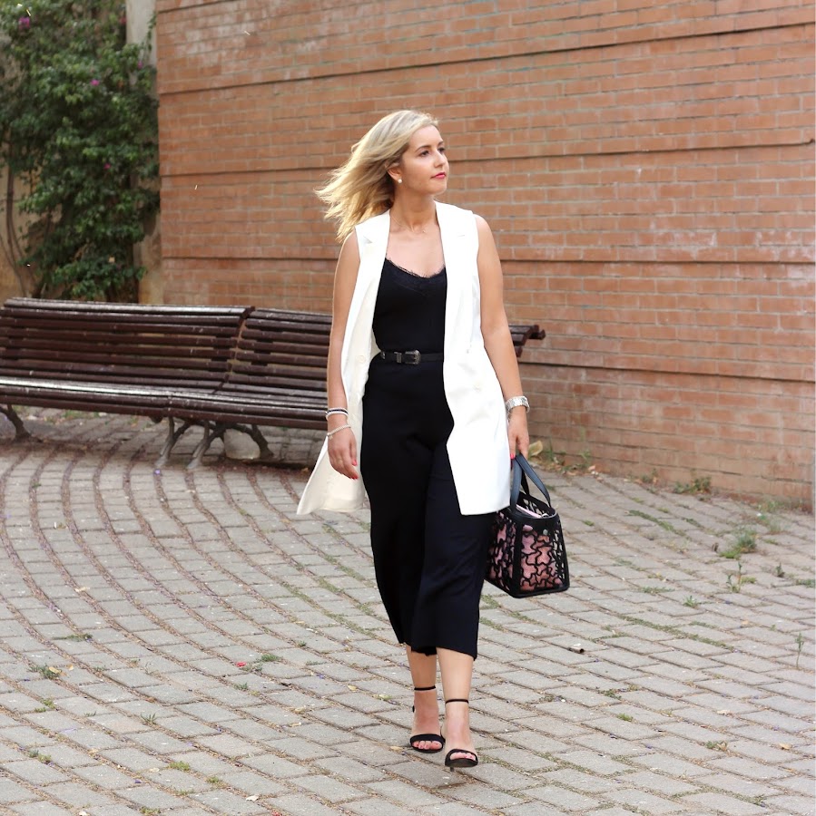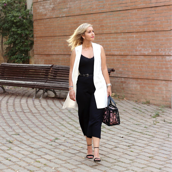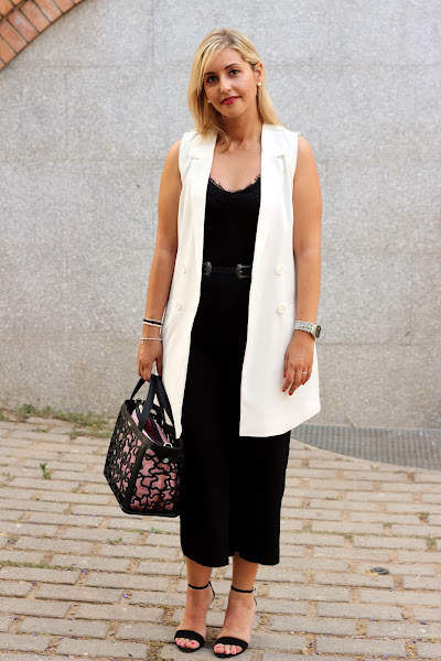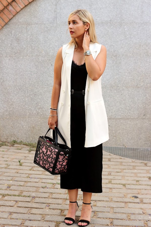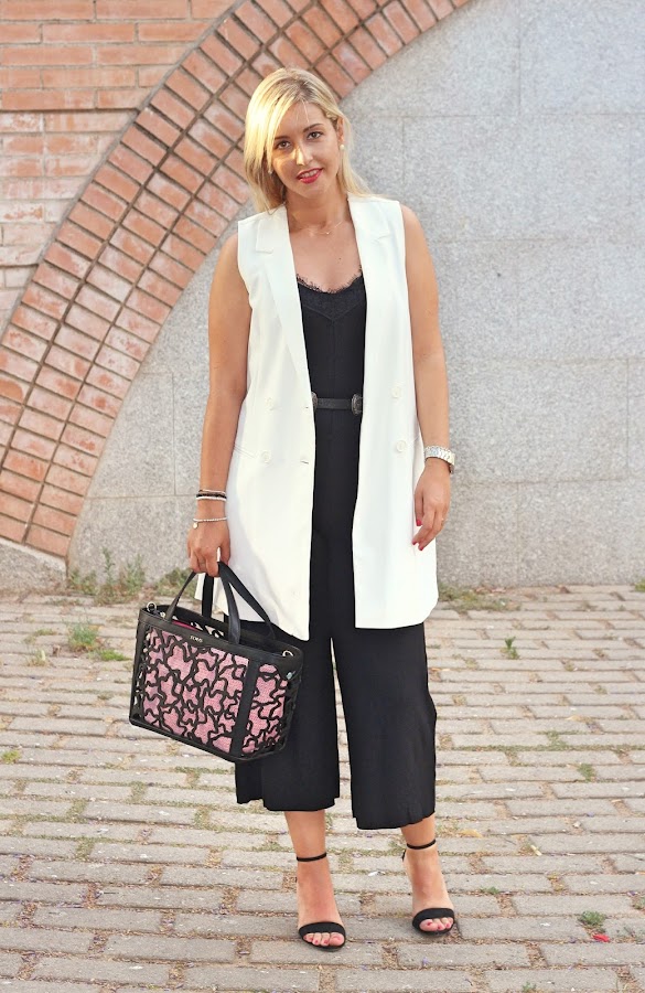 Hoy os traigo un look arregladito que es perfecto para ir a trabajar o para ir a cenar con nuestra pareja. En el look de hoy, combiné un mono culotte negro estilo lencero que me gustó porque aparte de ser super cómodo, es la típica prenda que cambiando los complementos puedes llevar en looks más formales, como el que os enseño hoy, o looks casuals. En esta ocasión, lo combiné con un chaleco largo blanco, que le daba ese toque de elegancia al look. Los accesorios del look fueron mi nuevo bolso de Tous y mis nuevas sandalias negras de Stradivarius.