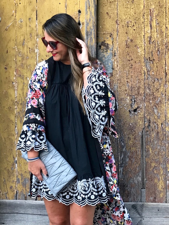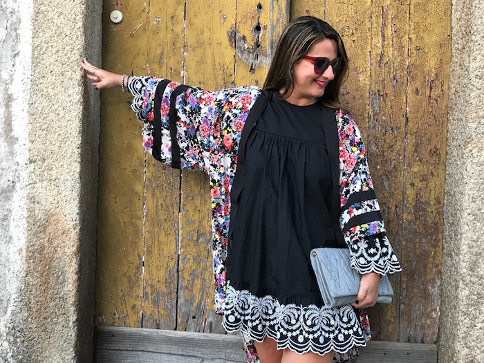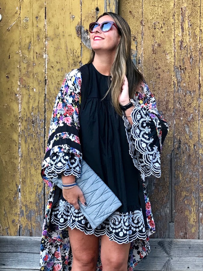 Kimono de flores con cola, combinado con vestido en color negro y detalles en blanco, eran las prendas perfectas para combinar con mis nuevas sandalias y clutch de piel matelassé de Miu Miu en color gris.