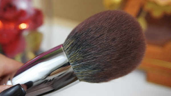 Es enoooorme y super tupida. Es una brocha para aplicar polvo (o para eso pienso usarla yo) super redondita. Por lo general suelen ser planas, pero esta es como una bolita de pelo.