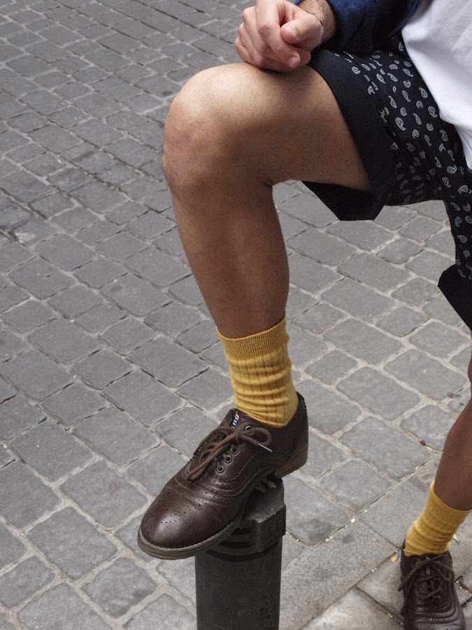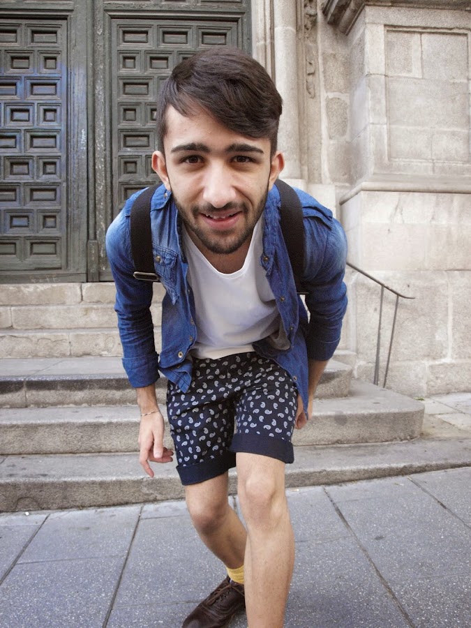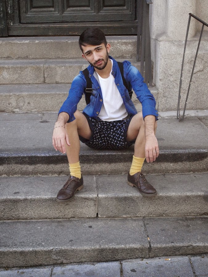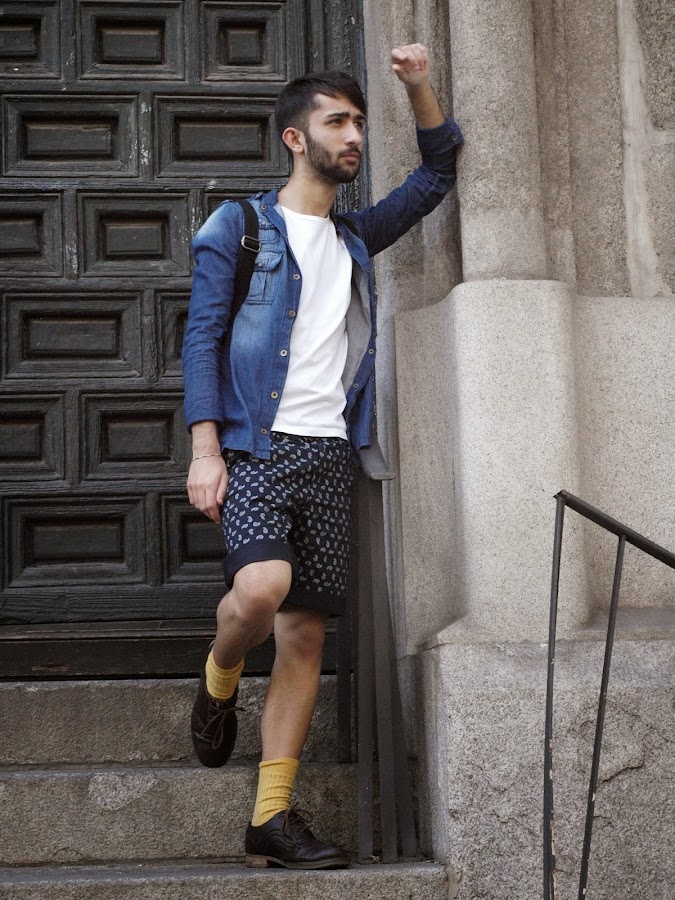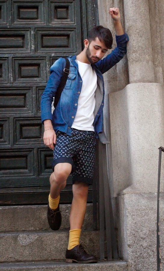 Lo hacia con un outfit MOSTAZA FORMEN, con short azul marino con detalles reto, una camisa vaquera sin cuello descolorida, una basic blanca, mocasiones marrones y calcetines Vintage color mostaza.