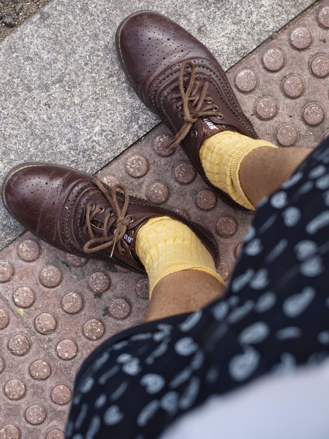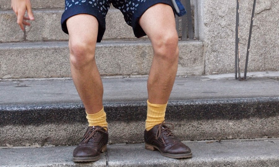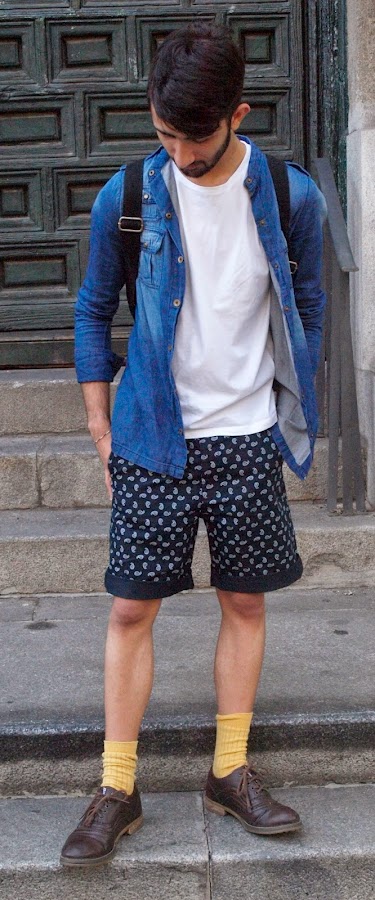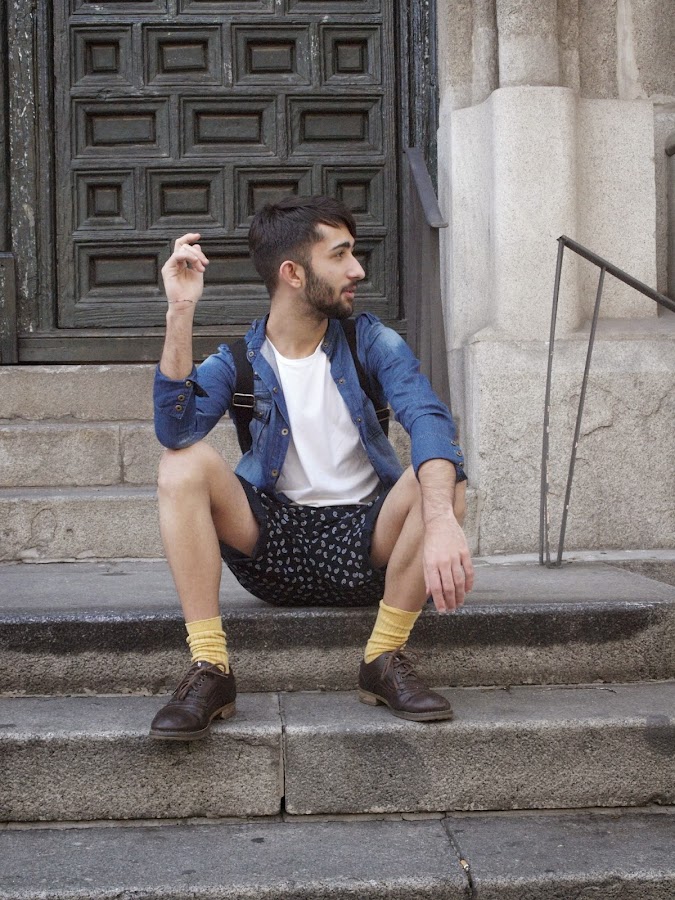 Lo hacia con un outfit MOSTAZA FORMEN, con short azul marino con detalles reto, una camisa vaquera sin cuello descolorida, una basic blanca, mocasiones marrones y calcetines Vintage color mostaza.