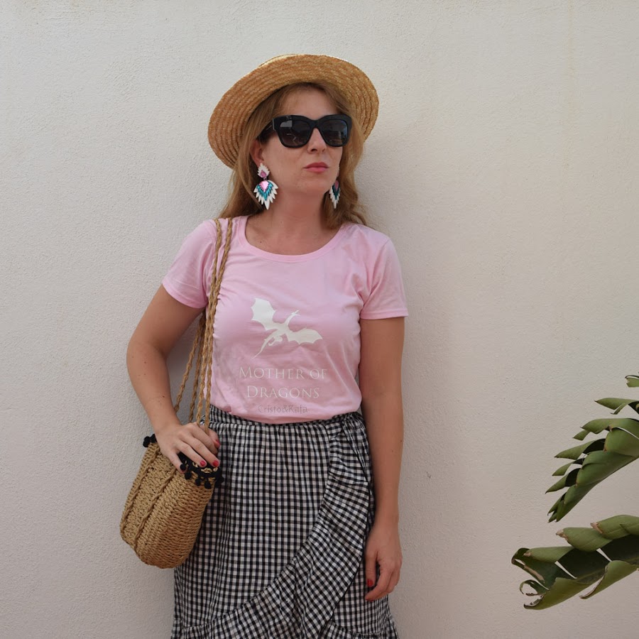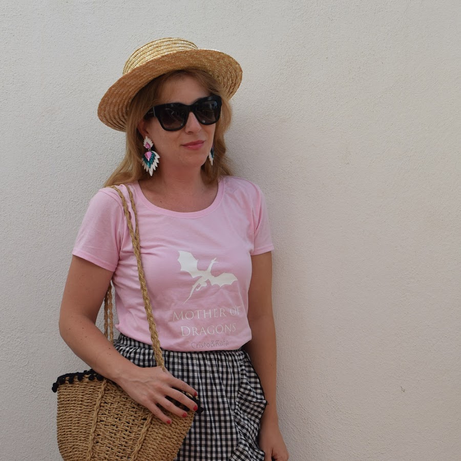 “Mother of Dragons”, poca explicación necesita. Mi personaje favorito de Juego de Tronos, en color rosa y con los nombres de mis dragones. Un toque friki que me gusta para looks sencillos como el que os muestro en las fotos.