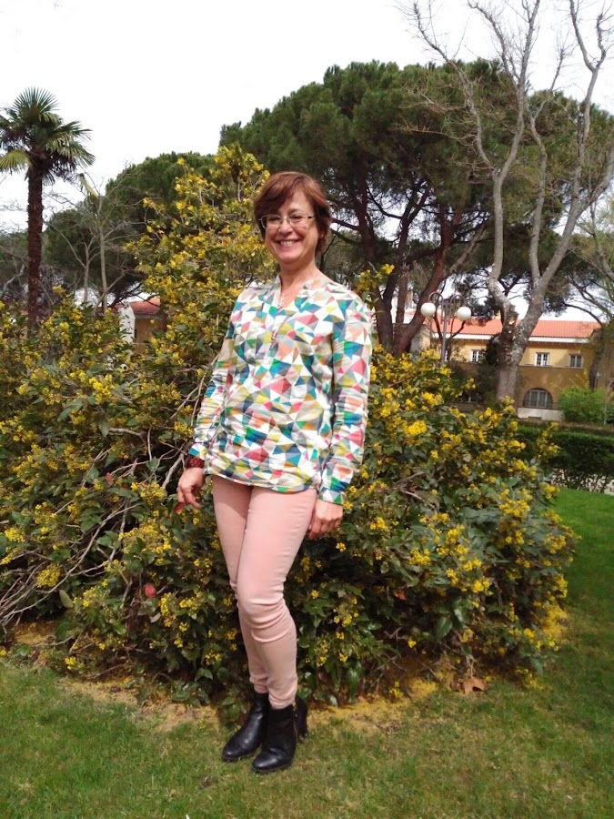 Hoy tengo el placer de presentaros a Victoria (una mujer redonda). Una mujer con la que da gusto pasar el tiempo porque es alegre, dicharachera y muy inteligente. Esta científica y amante de la música viste con una camisa tan especial como ella, llena de color y de contenido. Lo combina con pantalón pitillo rosa y botín de tacón negro. Esta prenda con todo ese colorido combina perfectamente con azul, negro, blanco, rosa...