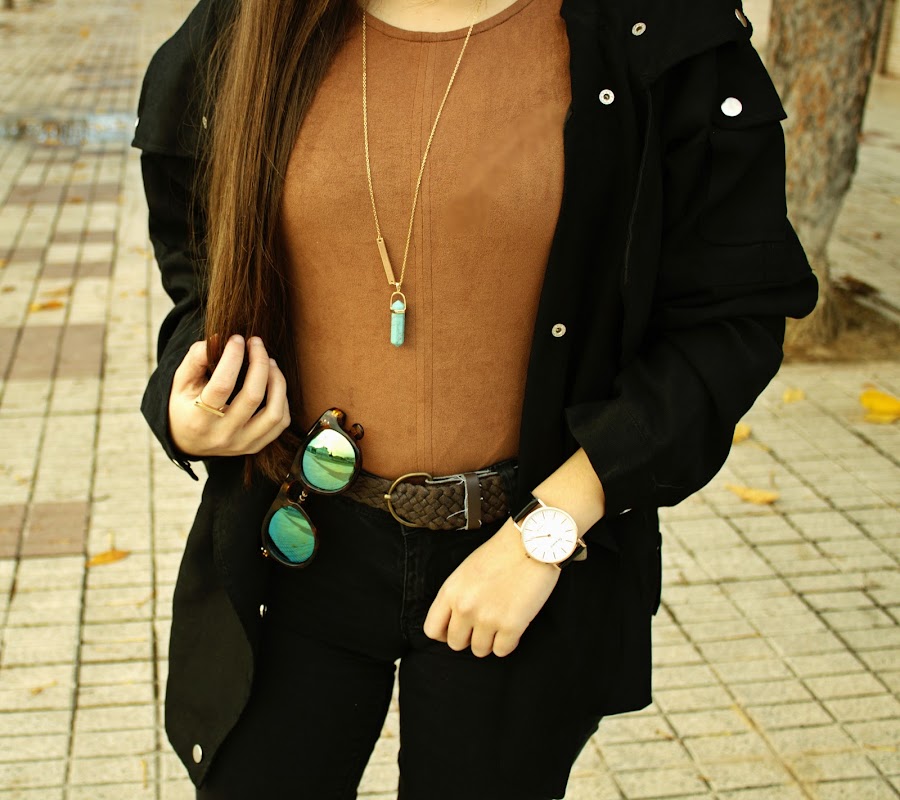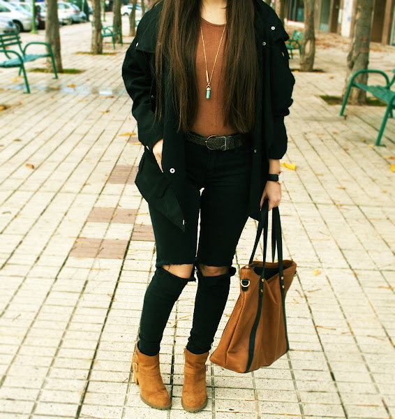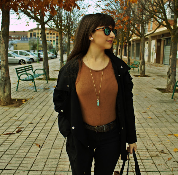 Este se compone de solo 2 colores, y la verdad que apostar por la idea de un conjunto bicolor me encanta. En este caso los colore elegidos fueron negro y marrón. Puede que esta combinación sea un poco "arriesgada" e inusual para algunos. Por último, para aportar un toque diferente añadí un par de complementos en turquesa, color de tendencia.