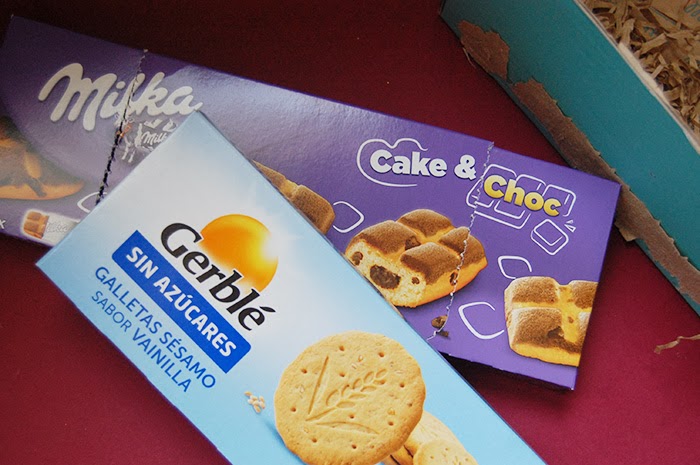 Y en cuanto a cositas dulces, nos trae una caja de galletas de sésamo con sabor a vainilla de Gerblé (nunca he probado la marca), y una especie de bizcochitos de Milka llamados Cake&Choc que ya nos hemos terminado.