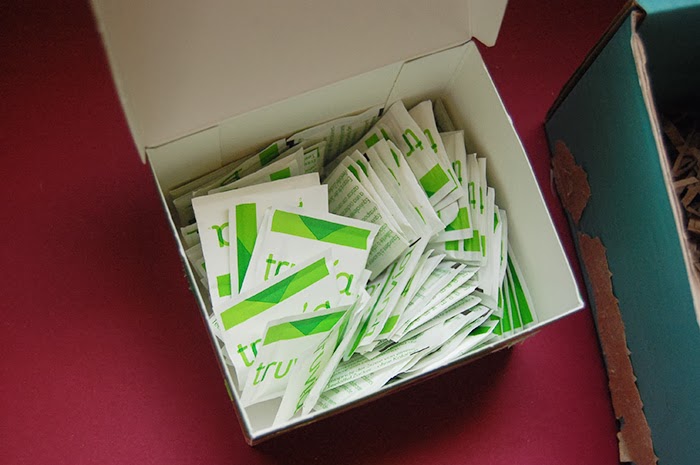 En cuanto a alimentación, el primer producto es un endulzante a base de Stevia llamado Truvía. Es de Azucarera, y la verdad es que nunca lo había visto. Como veis, viene en pequeñas monodosis.